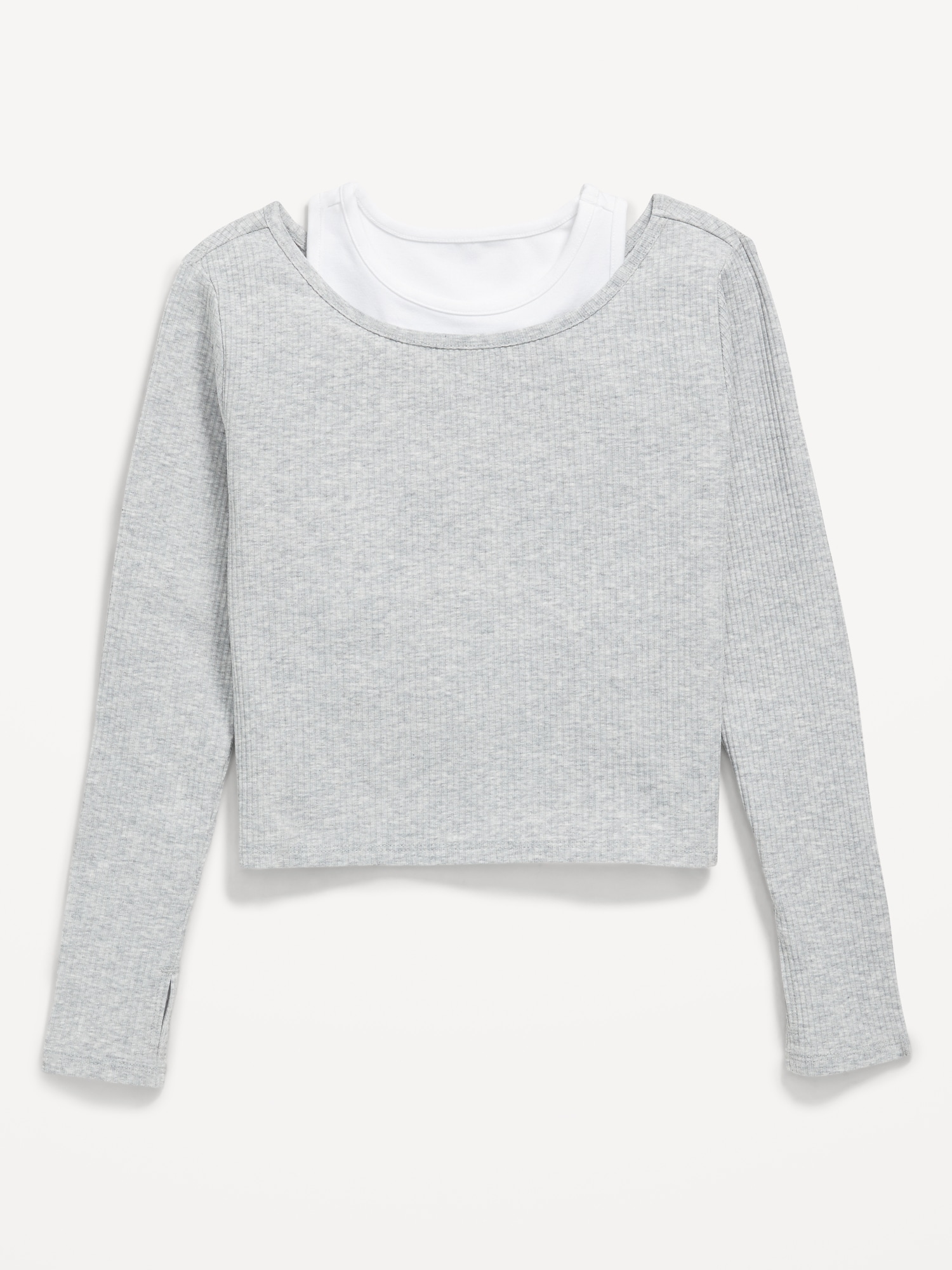 2-In-1 Ribbed Performance Top for Girls: boat neck, long sleeves, thumb-hole slits, tank top underneath, high neckline, sleeveless, #789715