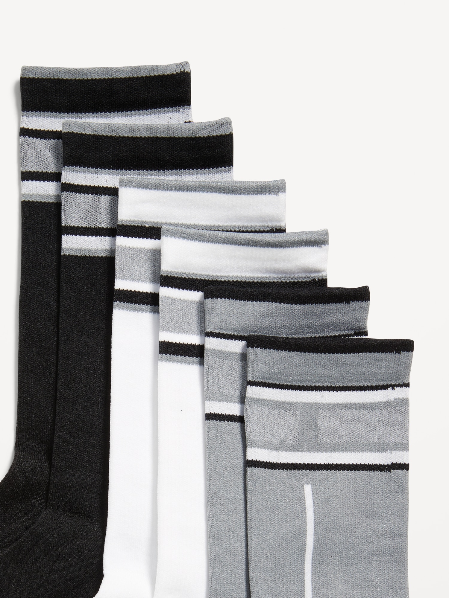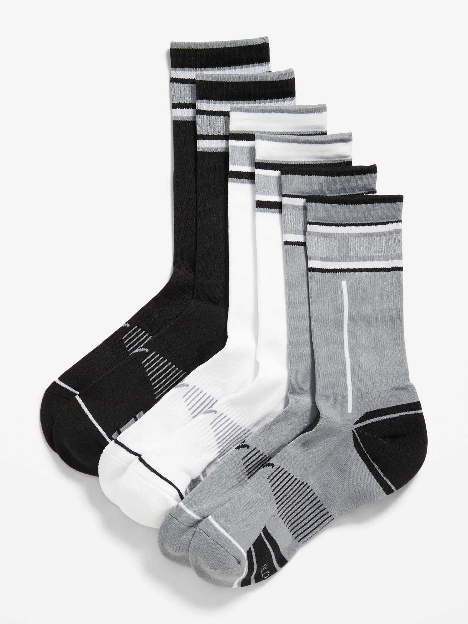 3-Pack Athletic Crew Run Socks for Men: pack includes 3 pairs of performance crew socks, ribbed upper for contour and support, contoured heel, breathable mesh, front cushioning for shock absorption, notched toe seams, go-dry wicks moisture, reflective trim, #763842