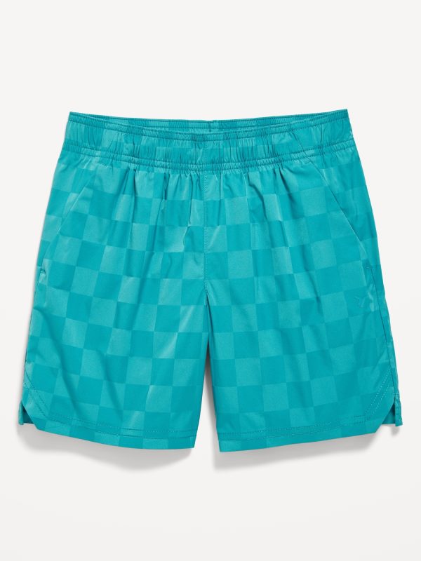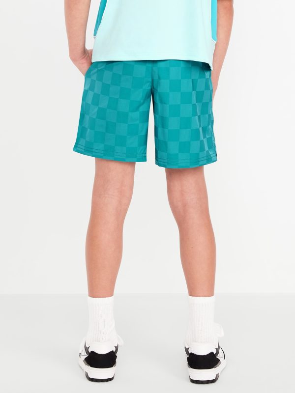 Above Knee Performance Shorts for Boys: elasticized waistband, functional drawstring, diagonal on-seam pockets, all-over checkered pattern, #762122