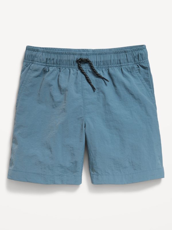 Above Knee Tech Shorts for Boys: elasticized waistband, functional drawstring, faux fly, diagonal on-seam pockets, single welt pocket at back, easy pull-on style, #860738