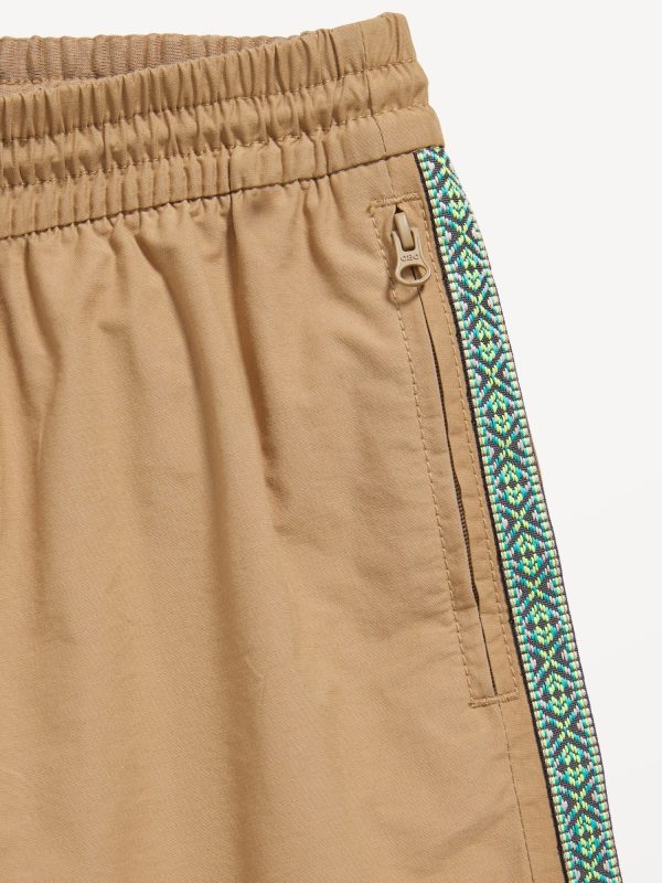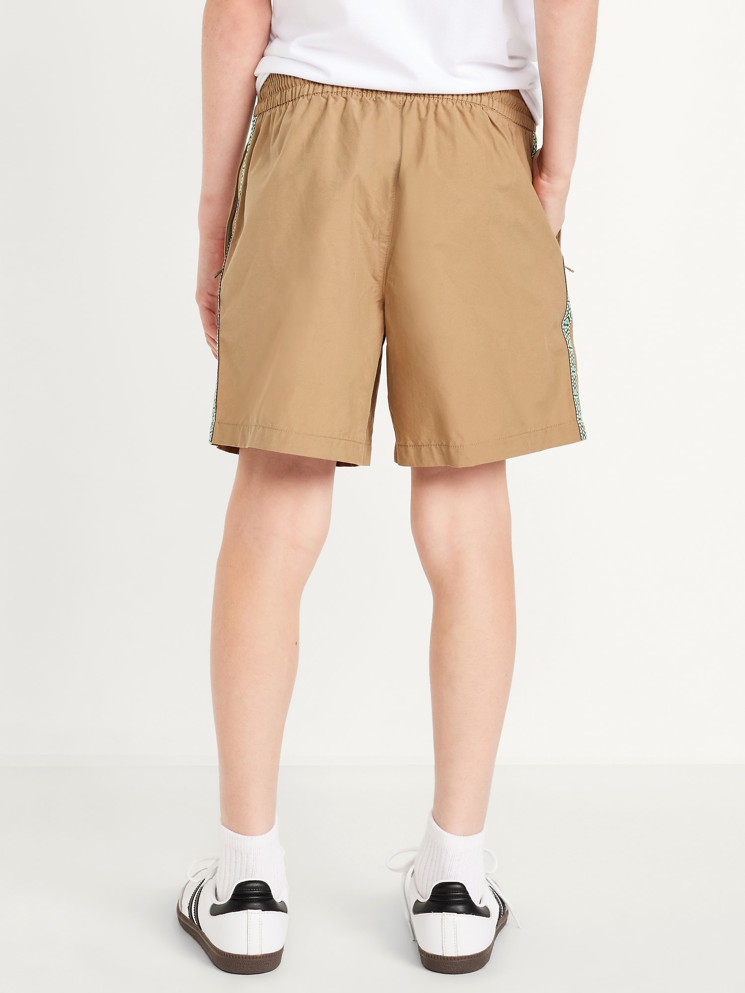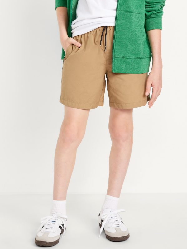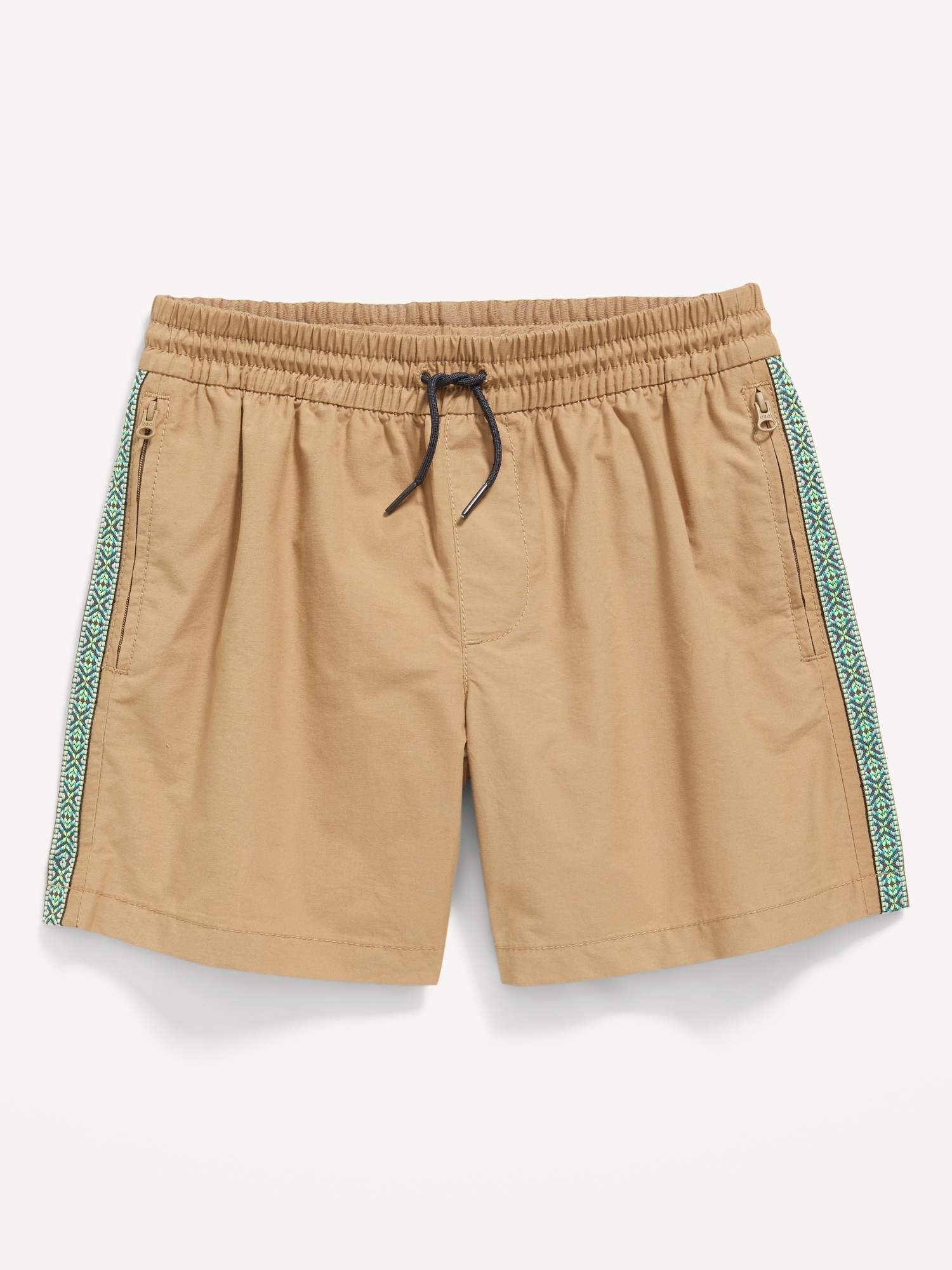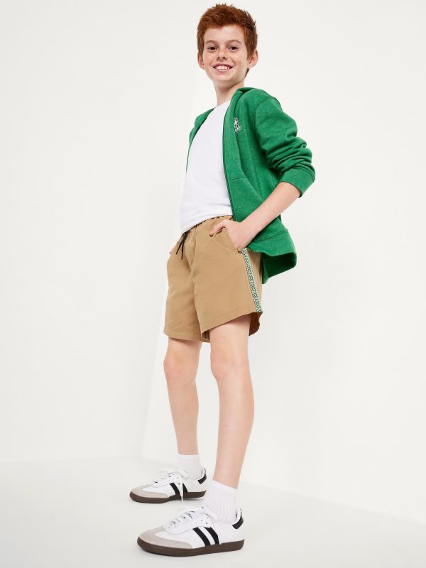 Above Knee Tech Zip-Pocket Shorts for Boys: elasticized waistband, functional drawstring, zippered pockets, contrasting patterned tape trim at sides, #686068
