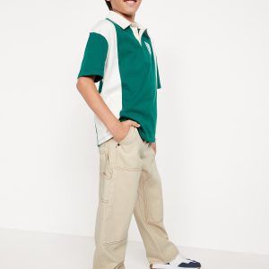 Baggy Carpenter Jeans for Boys: interior adjustable waistband, snap-button closure in sizes 5-8, regular button closure in sizes 10-20, zip fly, diagonal pockets, panel at each leg, utility patch pockets at back, built-in hammer loop at left leg, #766418