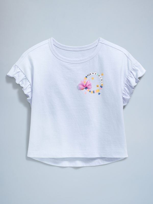 Birthday Graphic T-Shirt for Toddler Girls: The (Bestest) Birthday Shop!crew neck, short ruffle sleeves, graphic at front, rounded hem, #689939