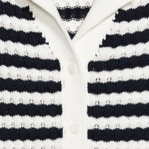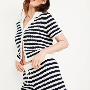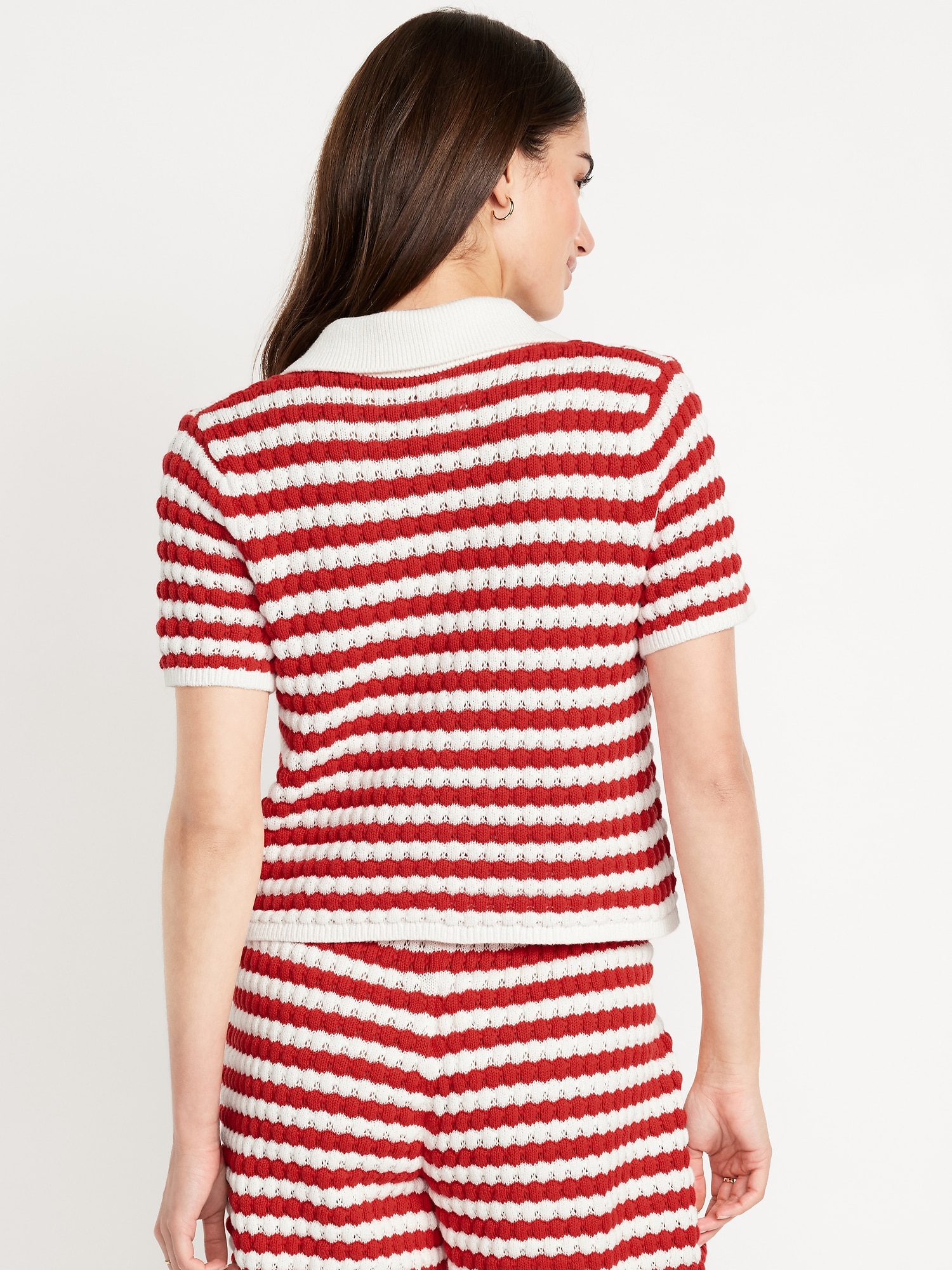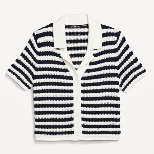 Button-Down Crochet Sweater: spread collar, short sleeves, full-button front, striped crochet, #761457