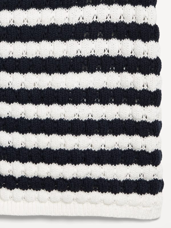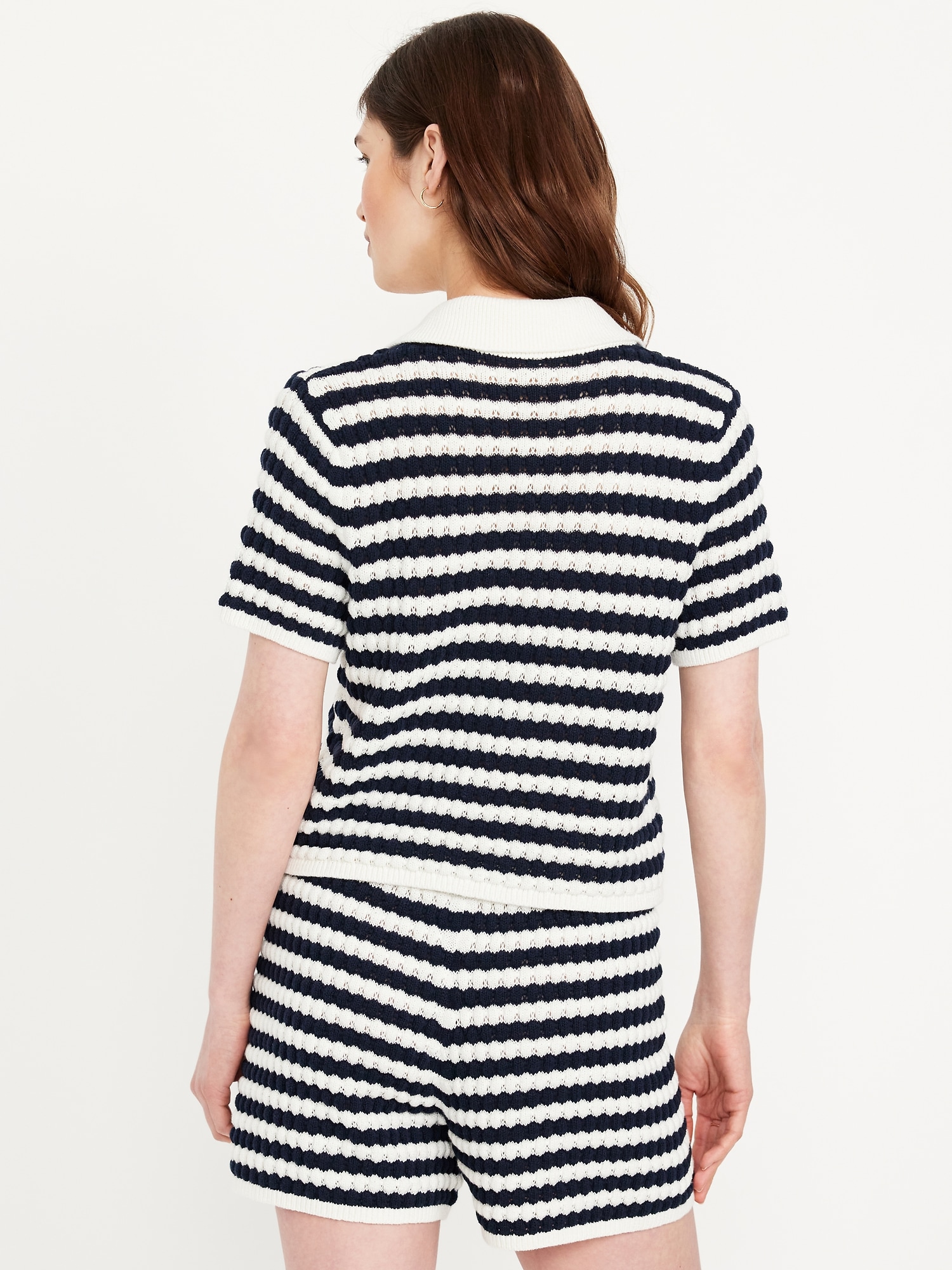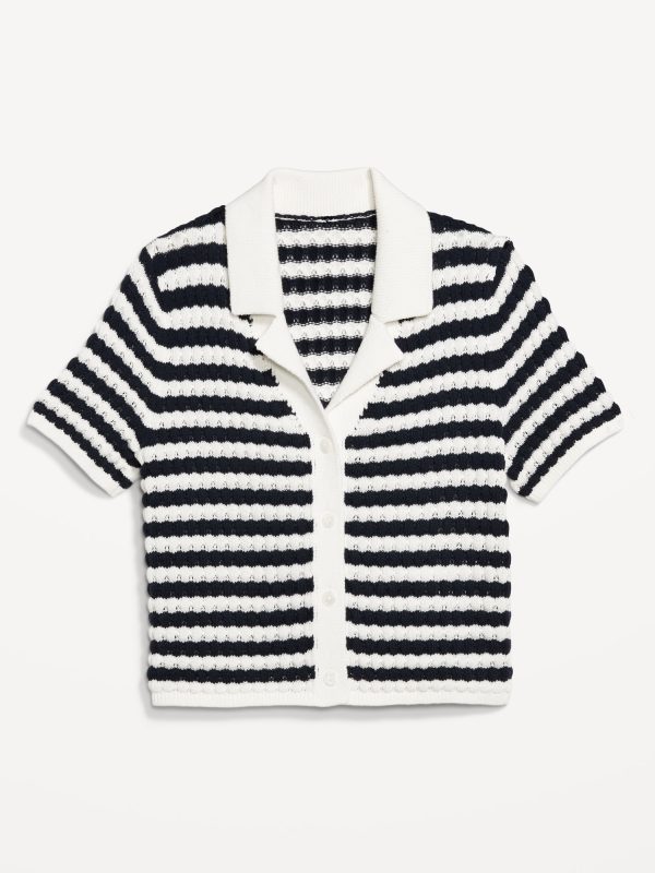 Button-Down Crochet Sweater: spread collar, short sleeves, full-button front, striped crochet, #761457