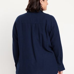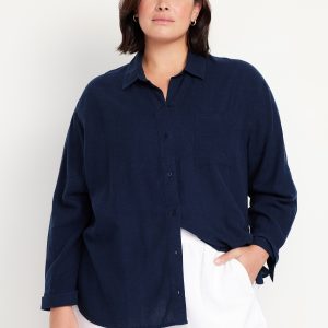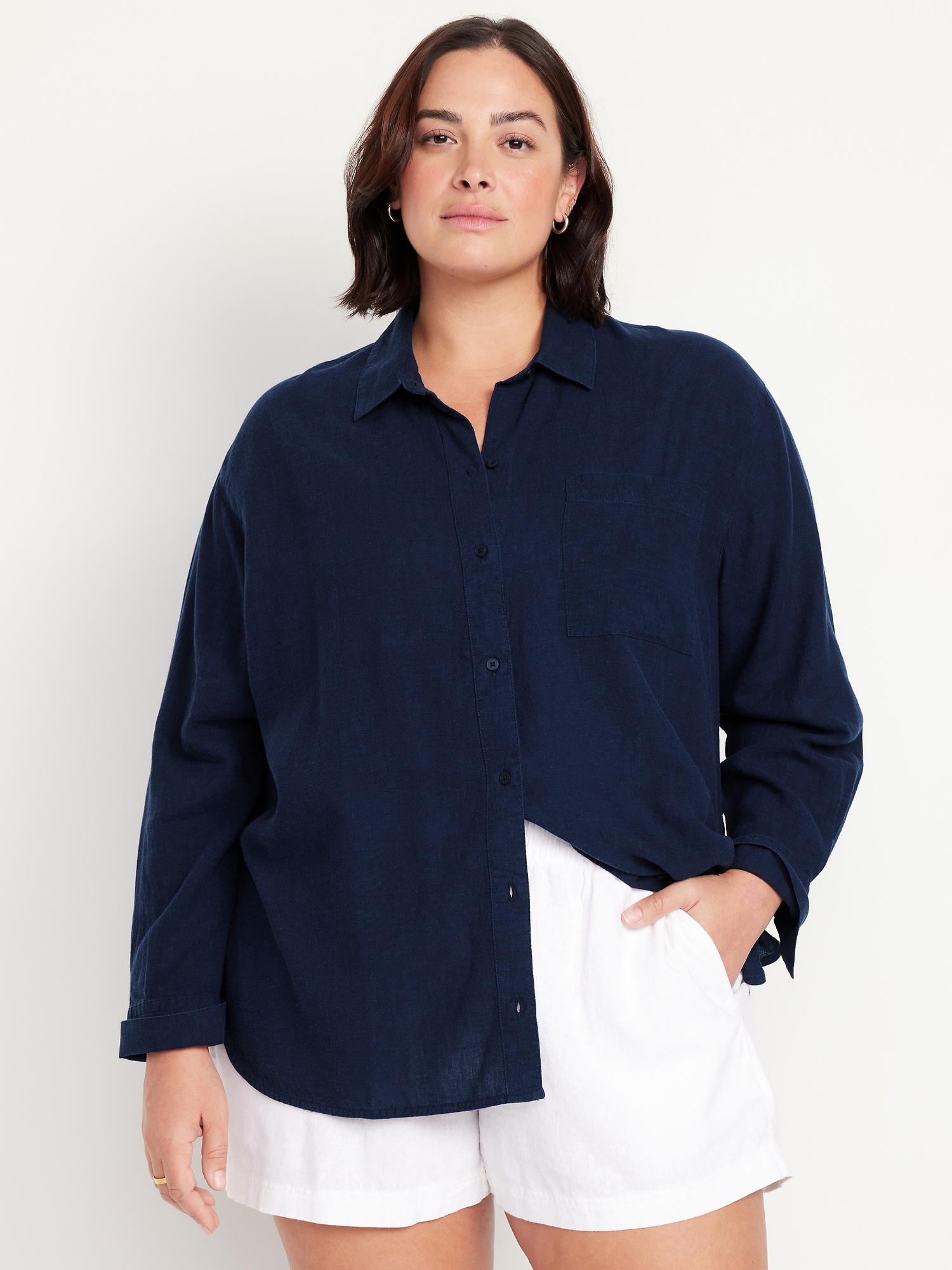 Button-Down Linen-Blend Striped Shirt: spread collar, long sleeves, buttoned cuffs, patch chest pocket, full-button front, striped print, curved hi-lo hem, #693623