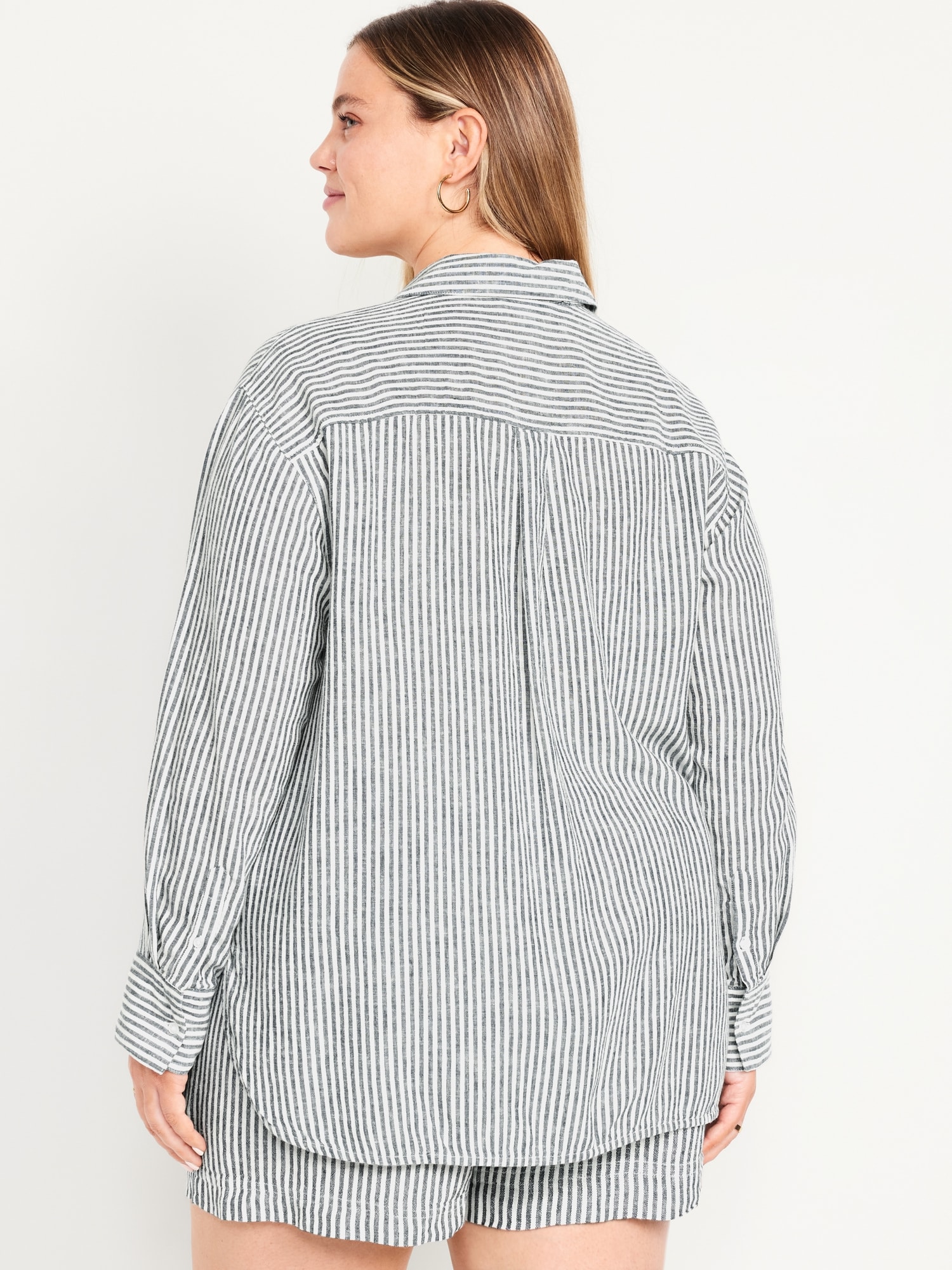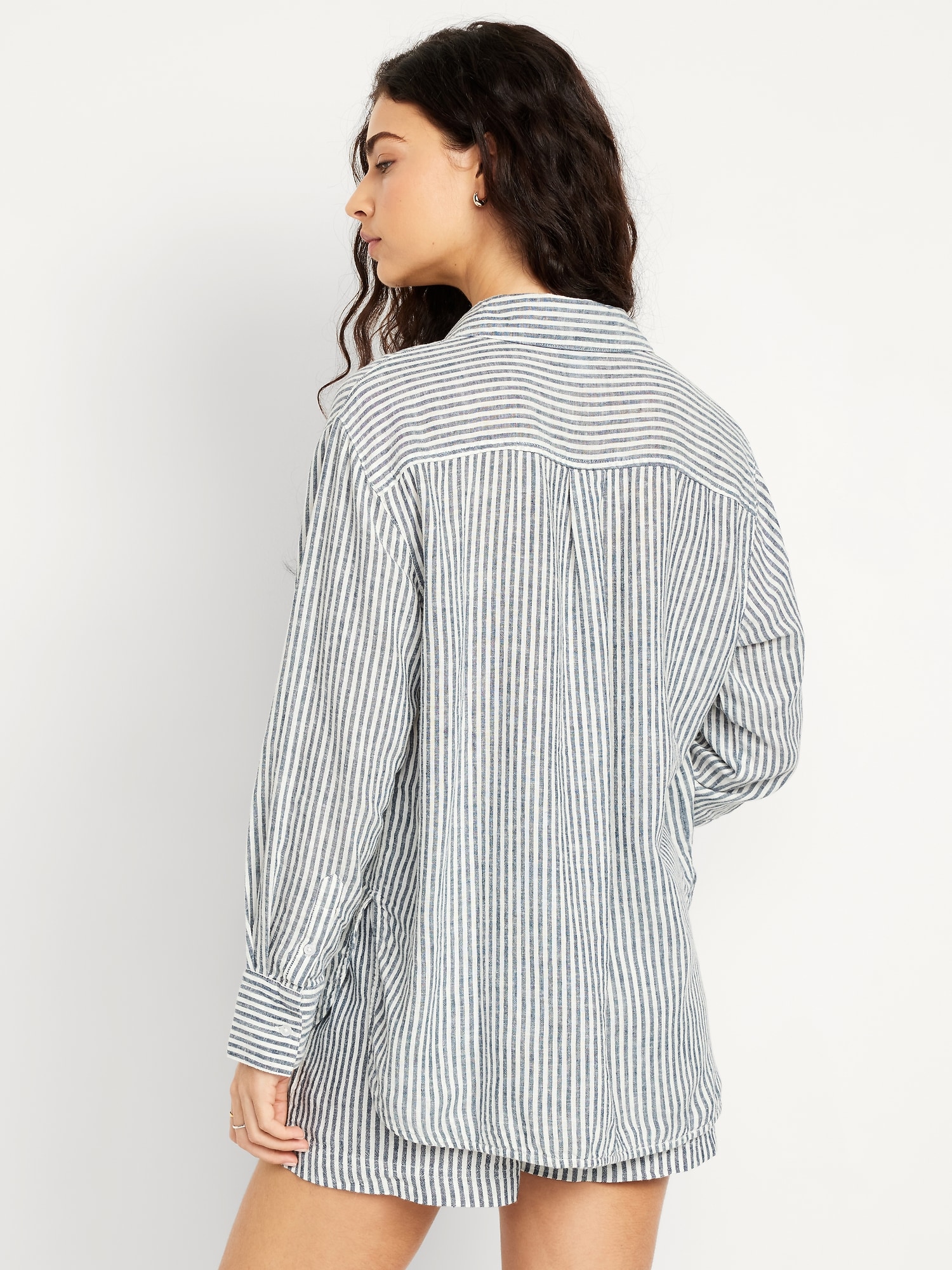 Button-Down Linen-Blend Striped Shirt: spread collar, long sleeves, buttoned cuffs, full-button front, patch chest pocket, curved hi-lo hem, all-over sun print, #745082