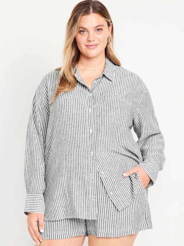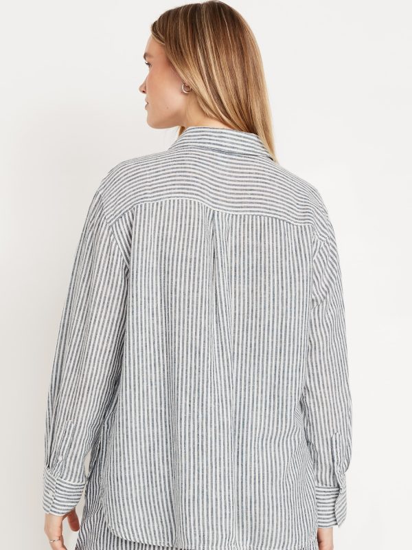 Button-Down Linen-Blend Striped Shirt: spread collar, long sleeves, buttoned cuffs, full-button front, patch chest pocket, curved hi-lo hem, all-over sun print, #745082