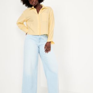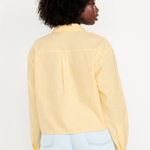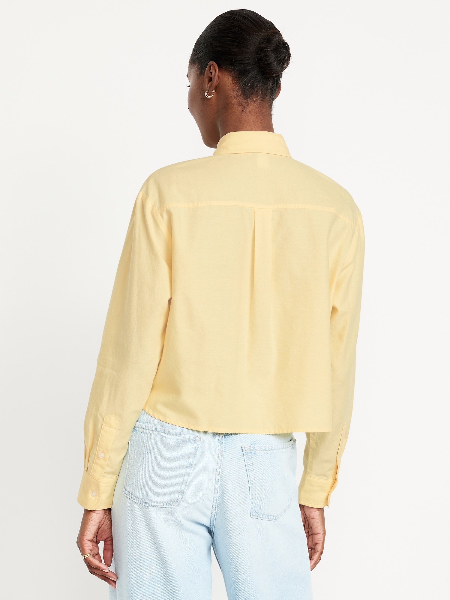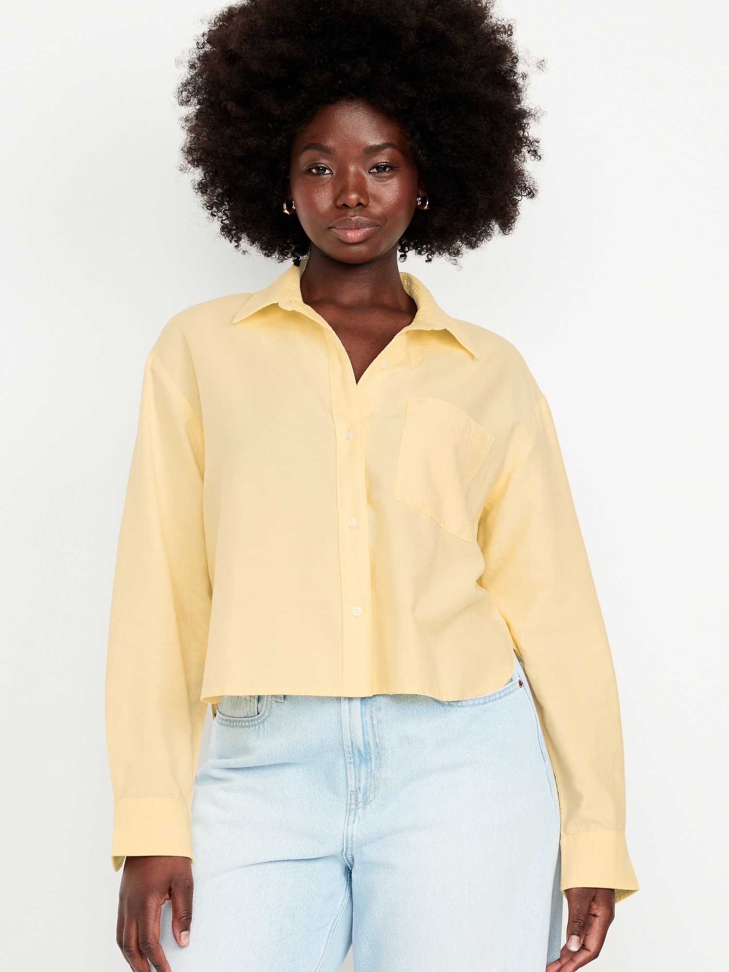 Button-Down Oxford Crop Shirt: spread collar, long sleeves with buttoned cuffs, full-button front, patch chest pocket, vertical striped print, #825106