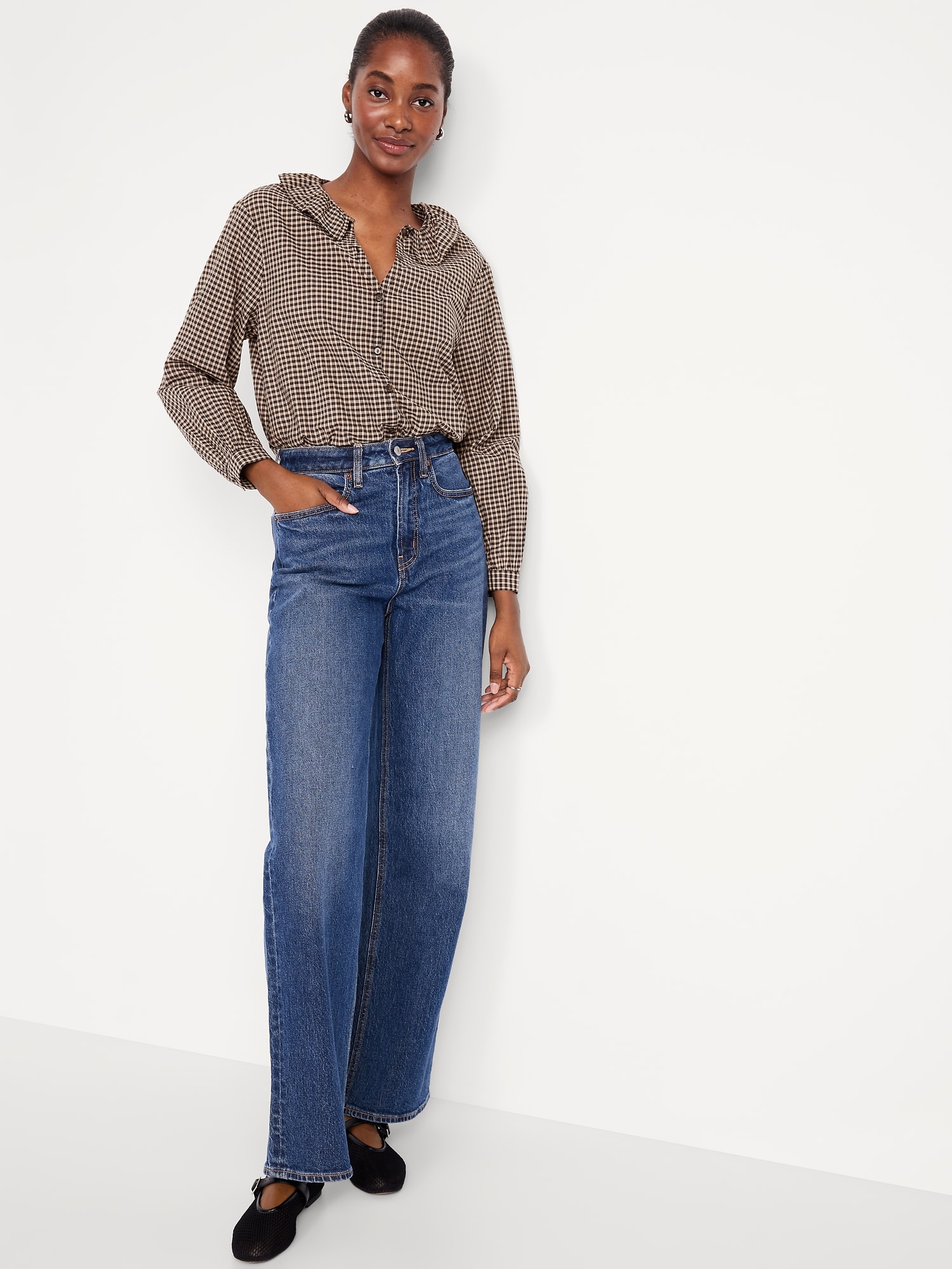 Button-Down Ruffle Shirt: ruffle collar, long sleeves, shirred-button cuffs, full-button front, plaid print, #805732