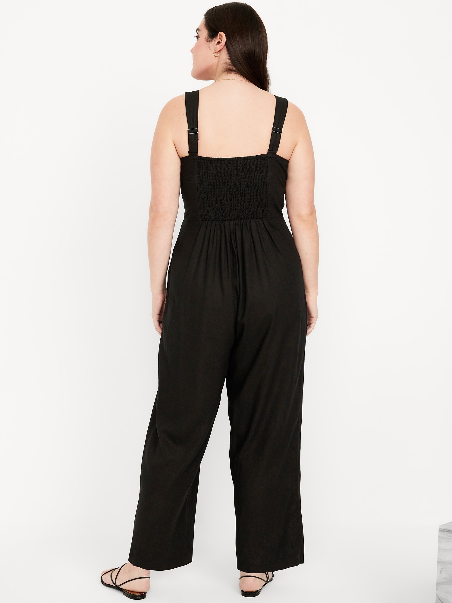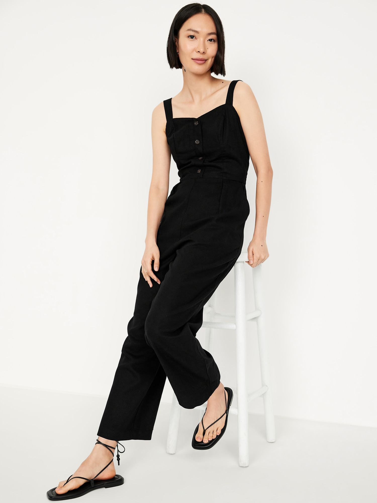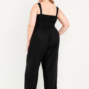 Button-Front Linen-Blend Cami Jumpsuit: sweetheart neckline, wide adjustable straps, four-button front, hip pockets, smocked back, #681202