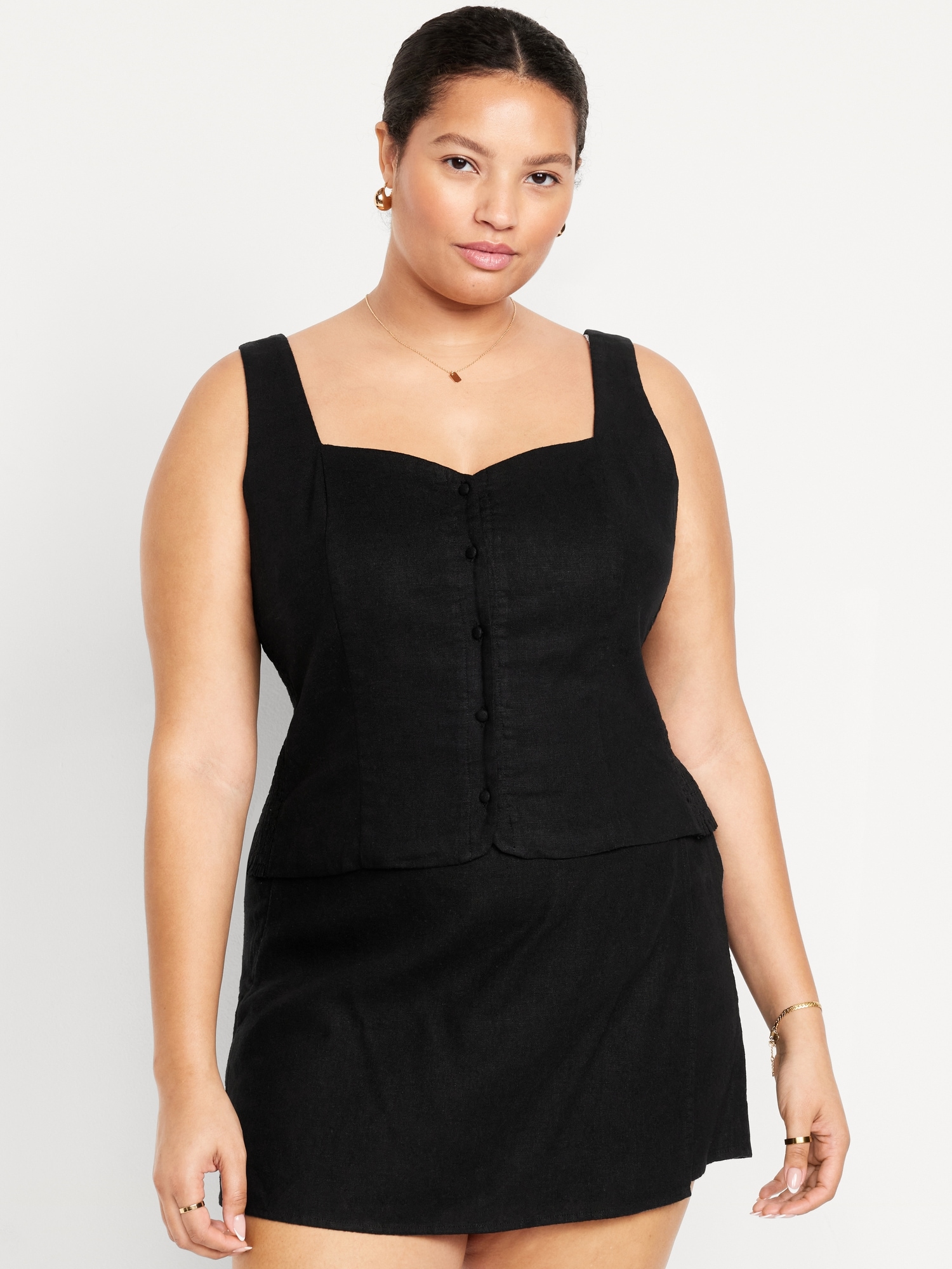 Button-Front Linen-Blend Vest: sweetheart neckline, wide straps, five-button front, smocked side panels, princess seams, #704063