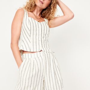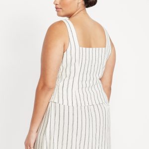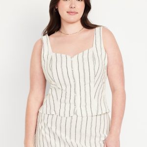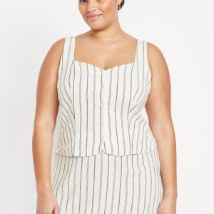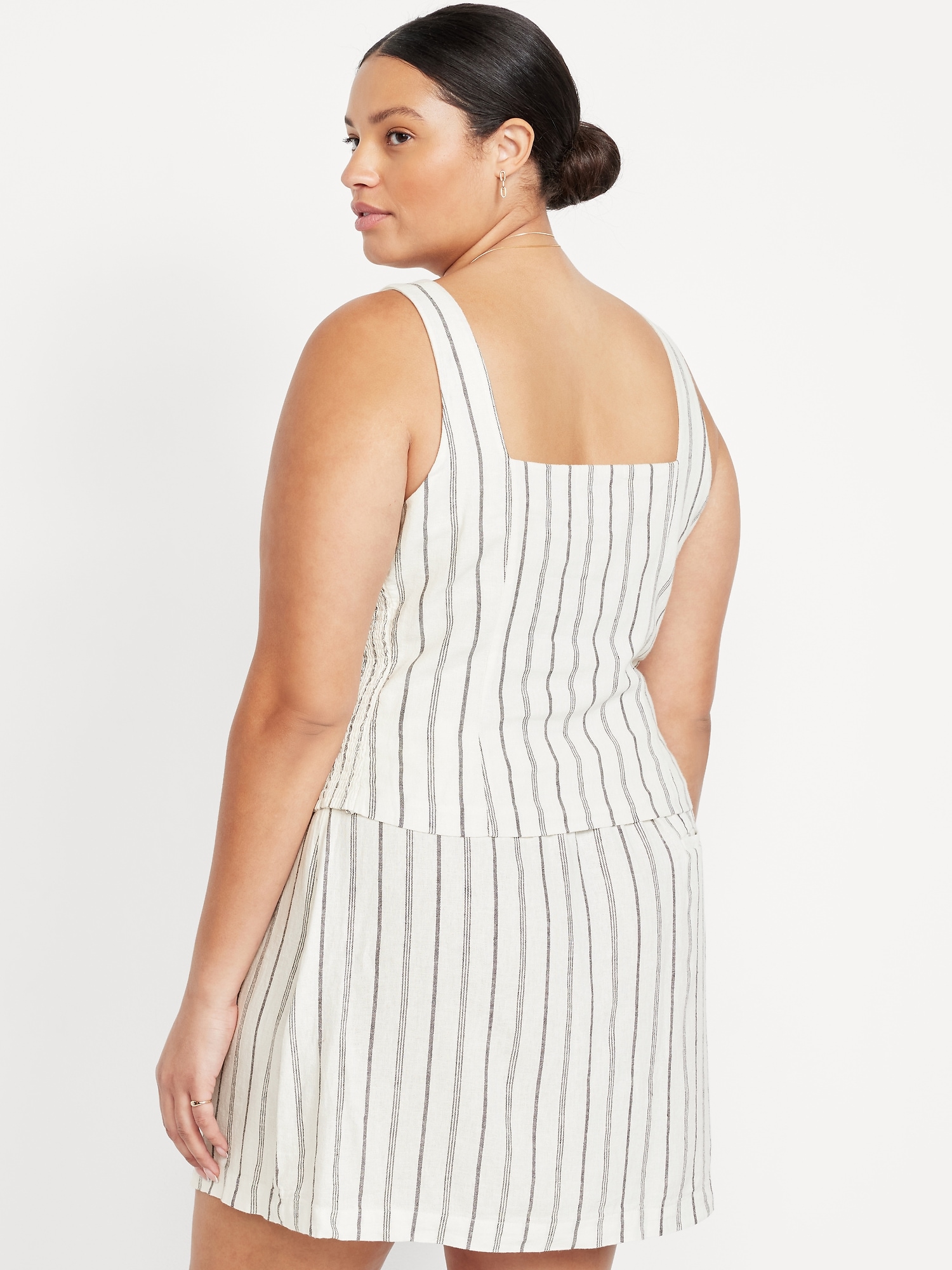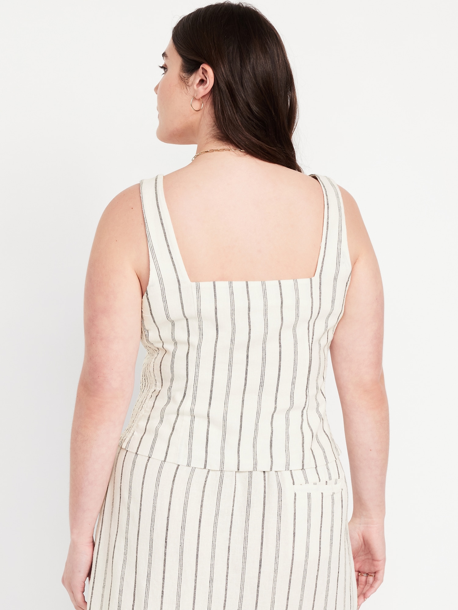 Button-Front Linen-Blend Vest: sweetheart neckline, wide straps, five-button front, smocked side panels, princess seams, striped print, #704099