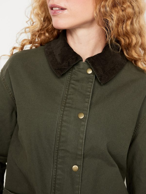Canvas Barn Jacket: corduroy collar, long sleeves with snap cuffs, full-snap front with hidden zipper, patch pockets, #766357