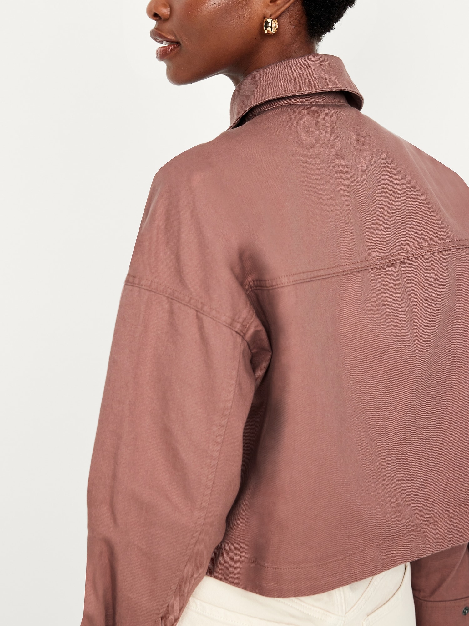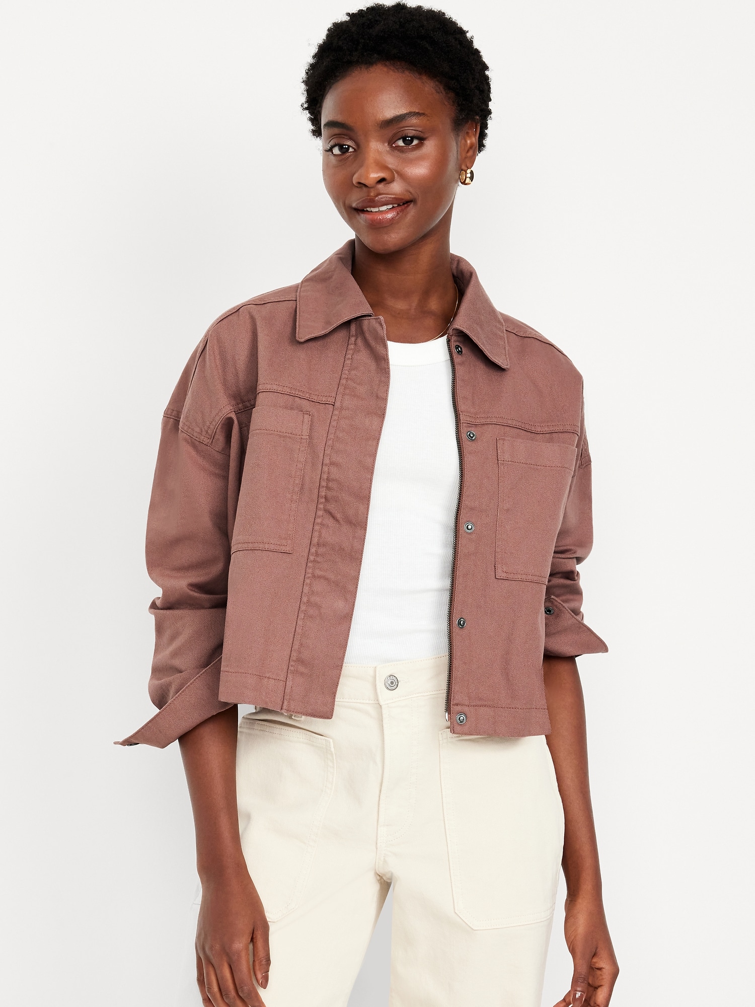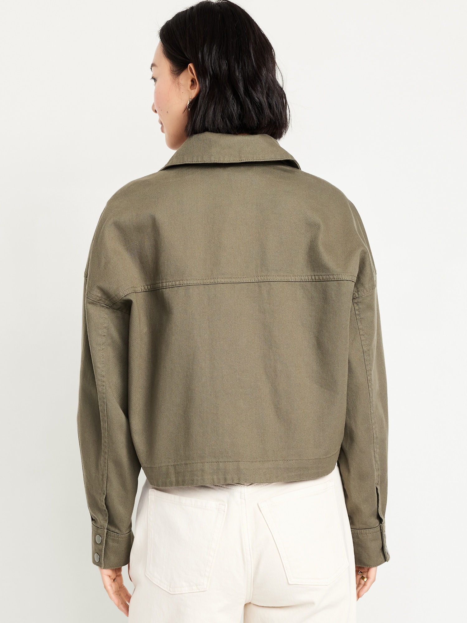 Canvas Crop Utility Jacket: spread collar, long sleeves, snap cuffs, snap front, patch chest pockets, seamed yoke, #663795