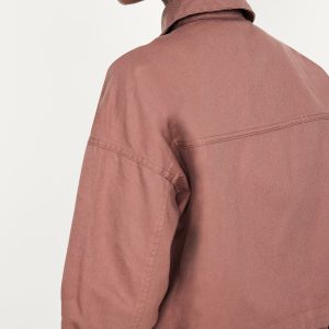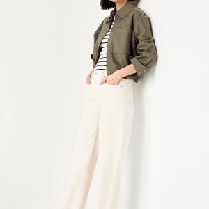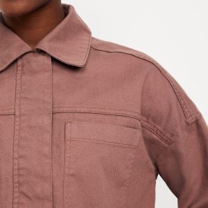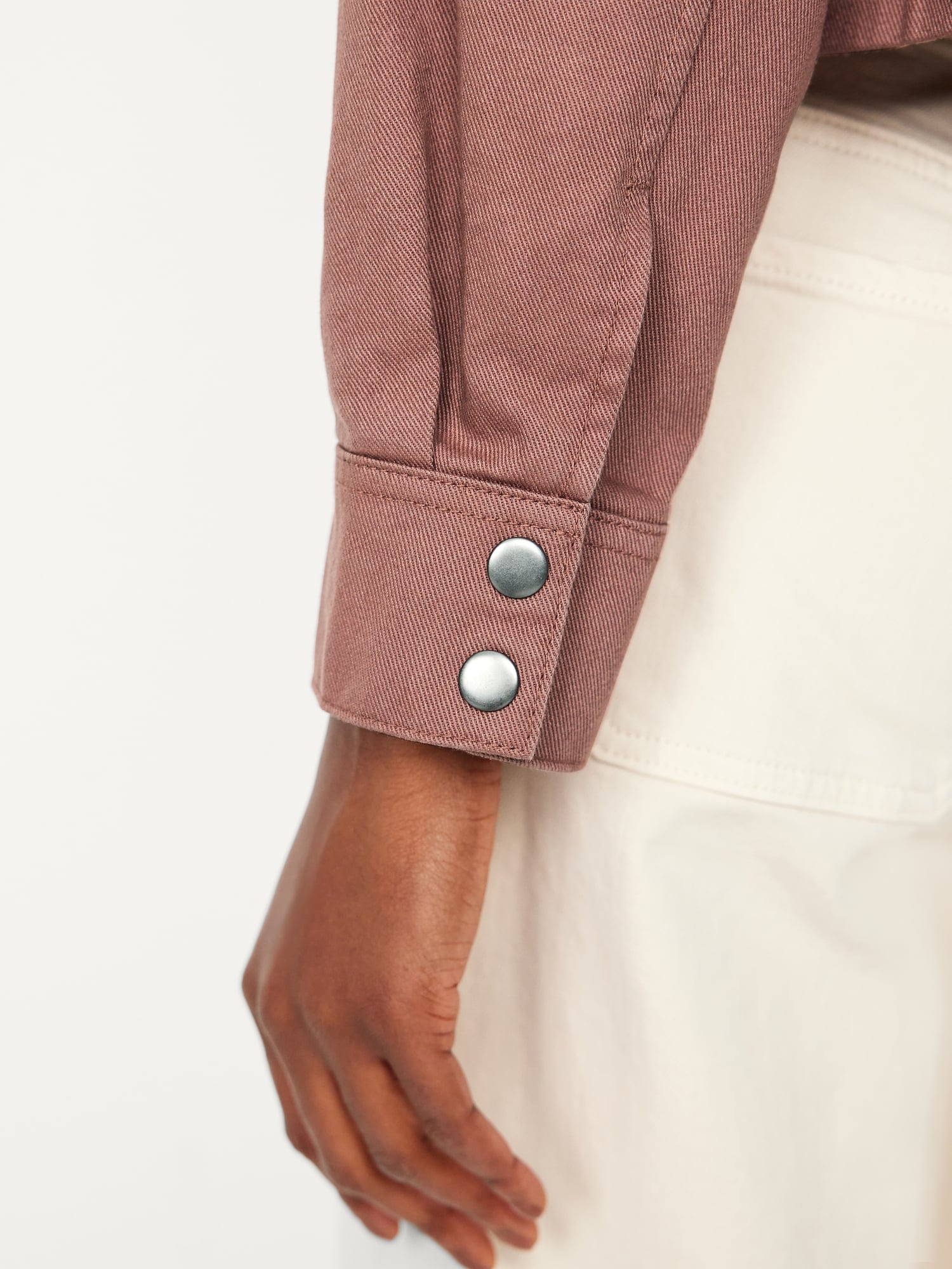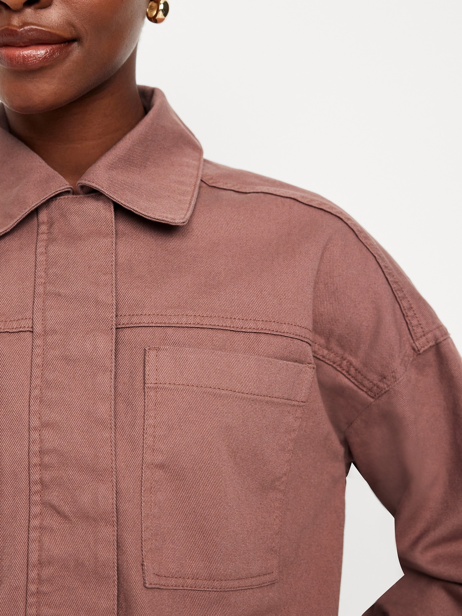 Canvas Crop Utility Jacket: spread collar, long sleeves, snap cuffs, snap front, patch chest pockets, seamed yoke, #663795