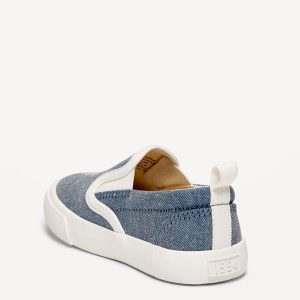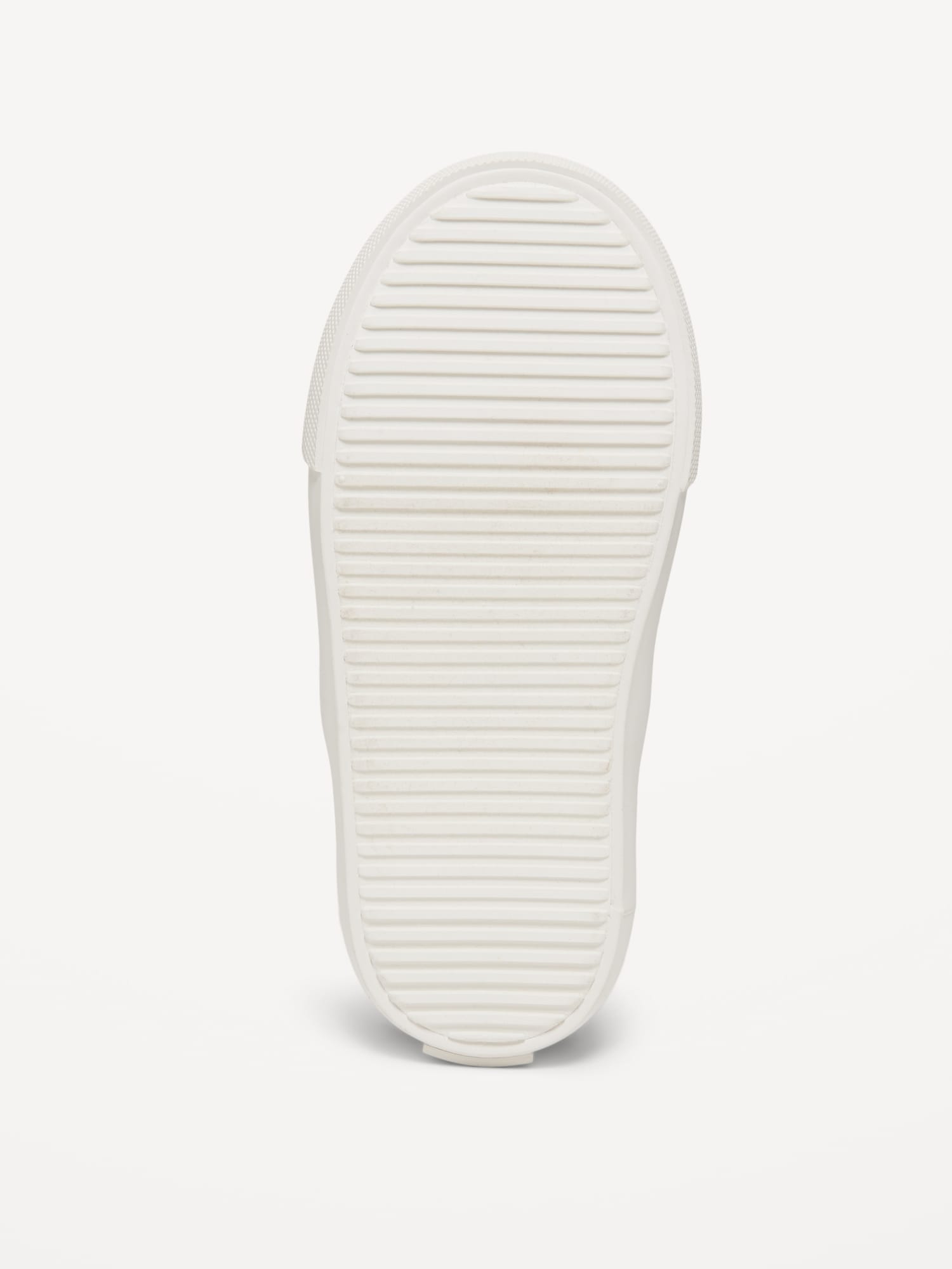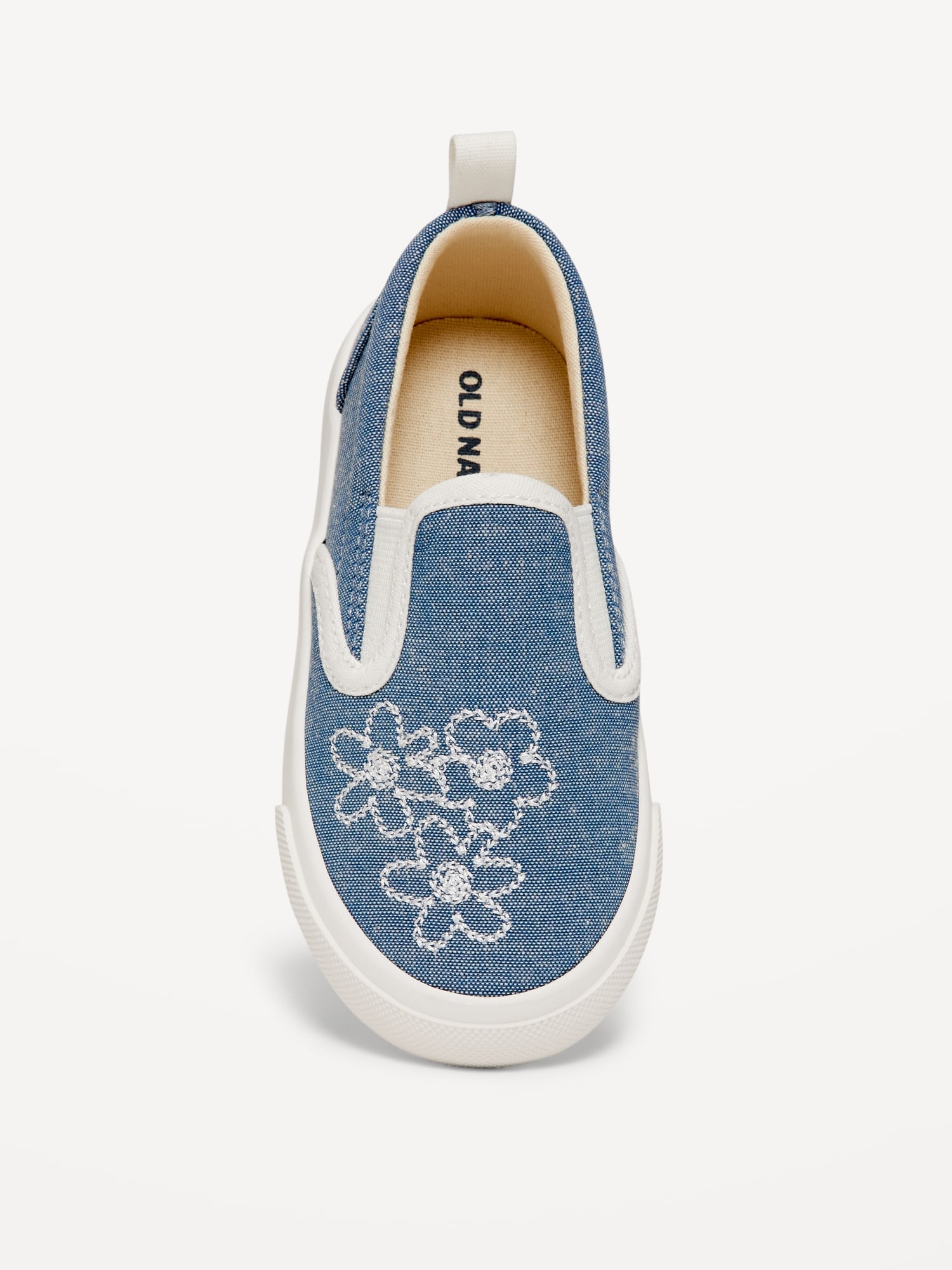 Canvas Slip-On Sneakers for Toddler Girls: webbed-elastic side goring, cushioned insoles, rubber midsole with strawberry patch, flocked outsole, pull tab at heel, #688497