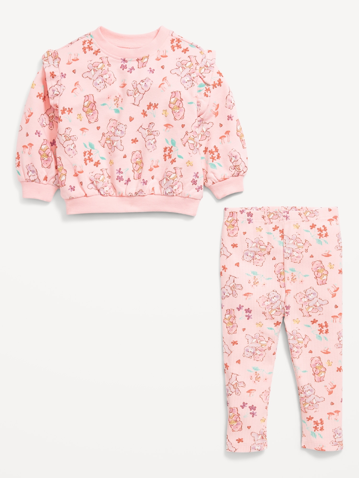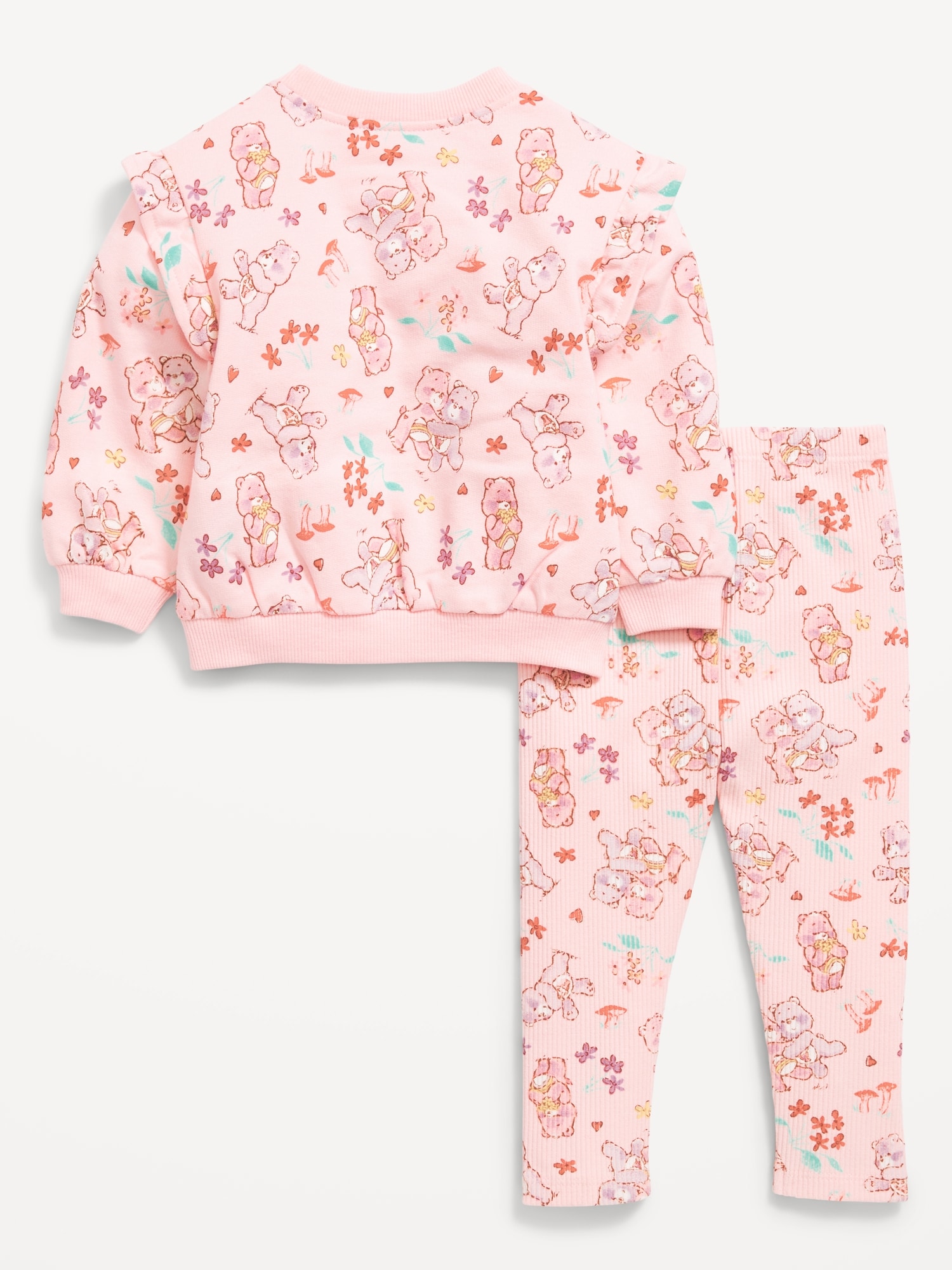 Care Bears™ Sweatshirt and Leggings Set for Baby: crew neck, long sleeves, ruffle overlay along shoulders, drop shoulders, matching leggings, elasticized waistband, licensed graphic, Care Bears TM & © 2025 Those Characters From Cleveland. All Rights Reserved., #803649