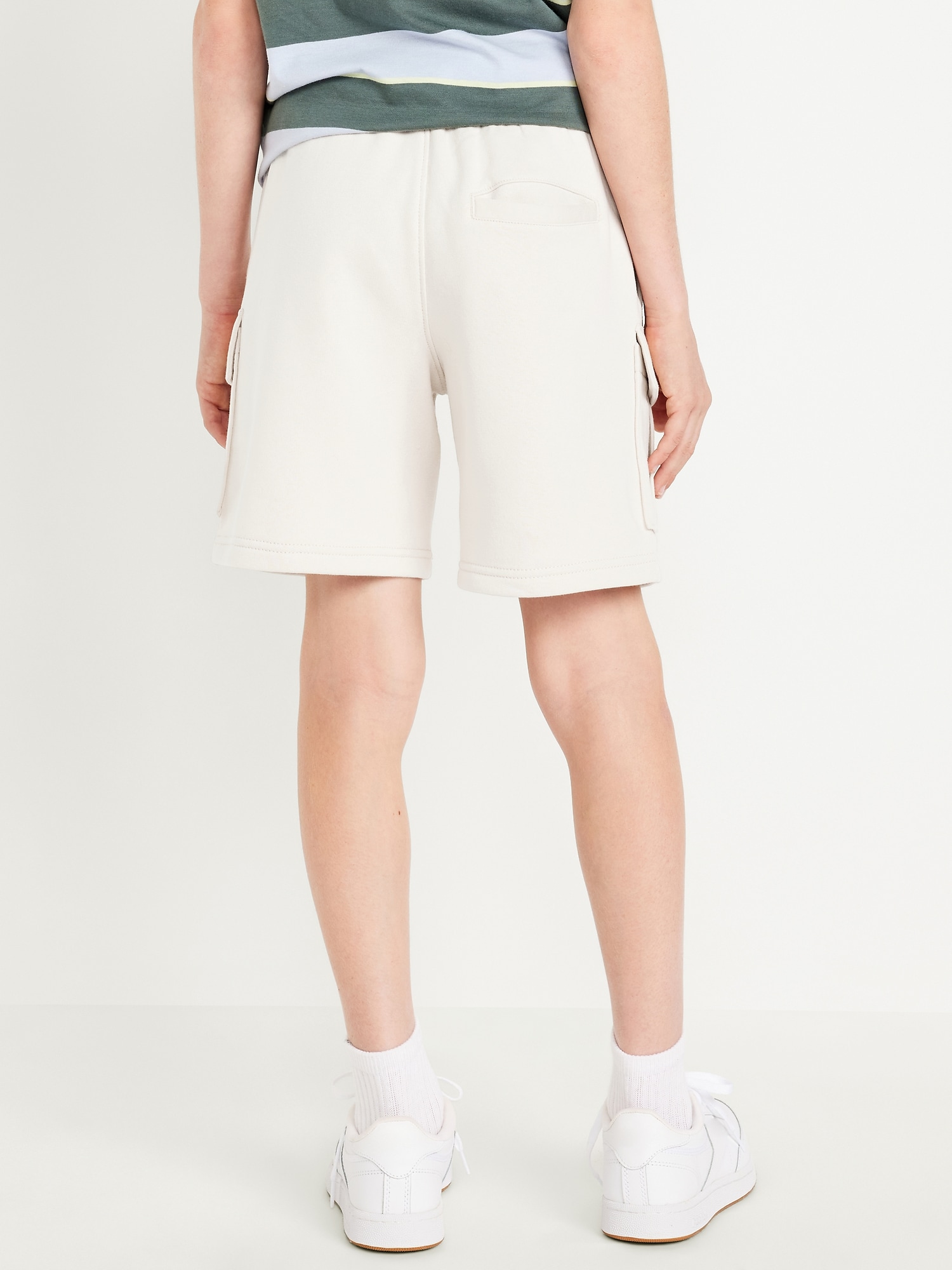 Cargo Fleece Shorts for Boys: elasticized waistband, functional drawstring, on-seam side pockets, flap adhesive secure-close cargo pockets, single welt pocket at back, #693213
