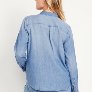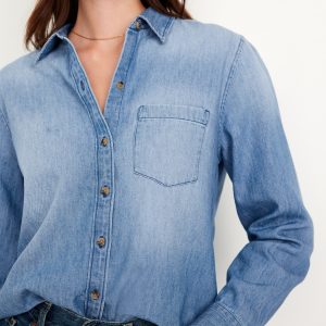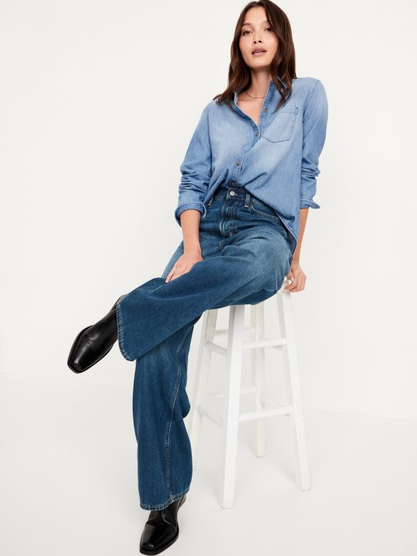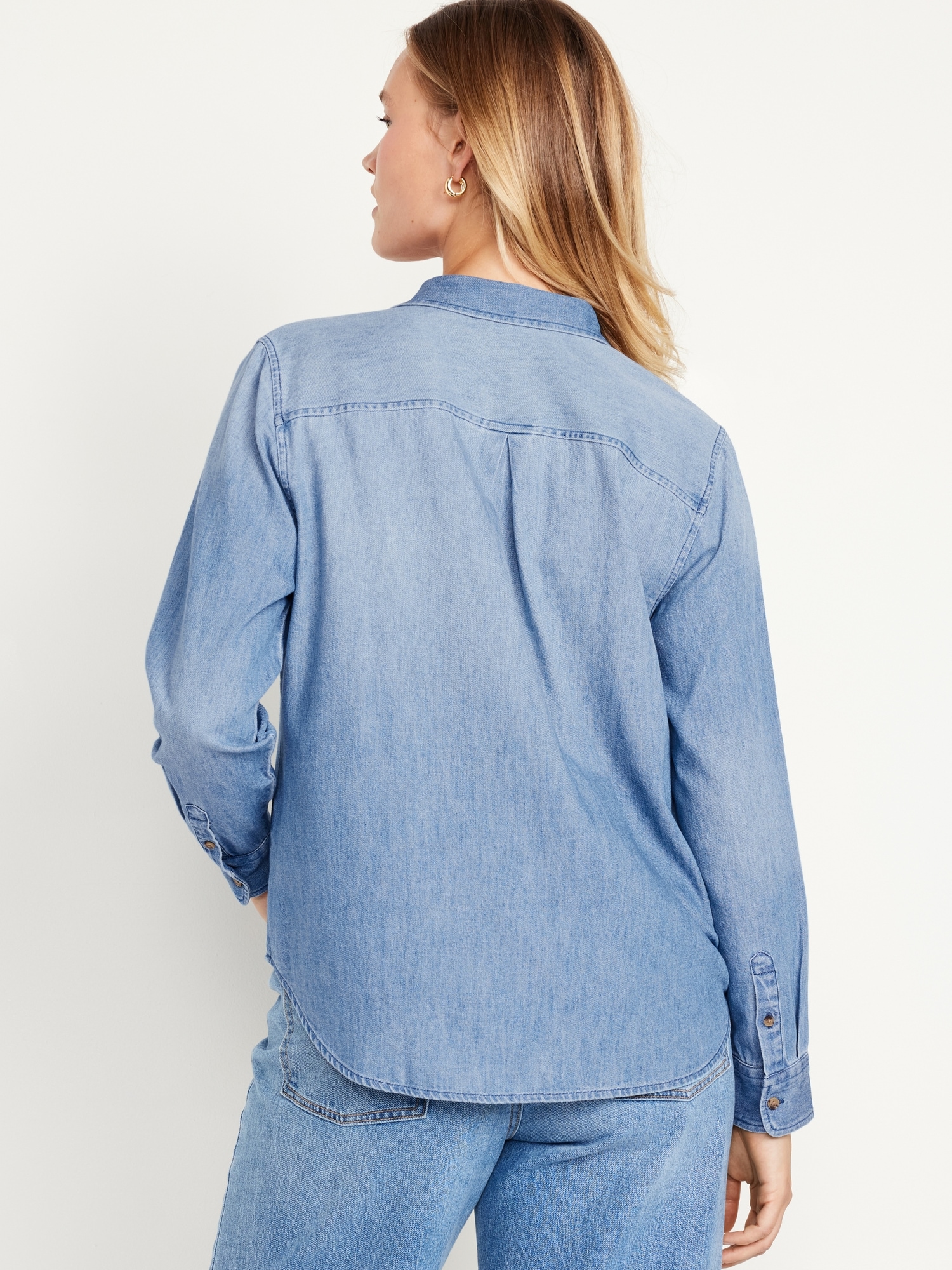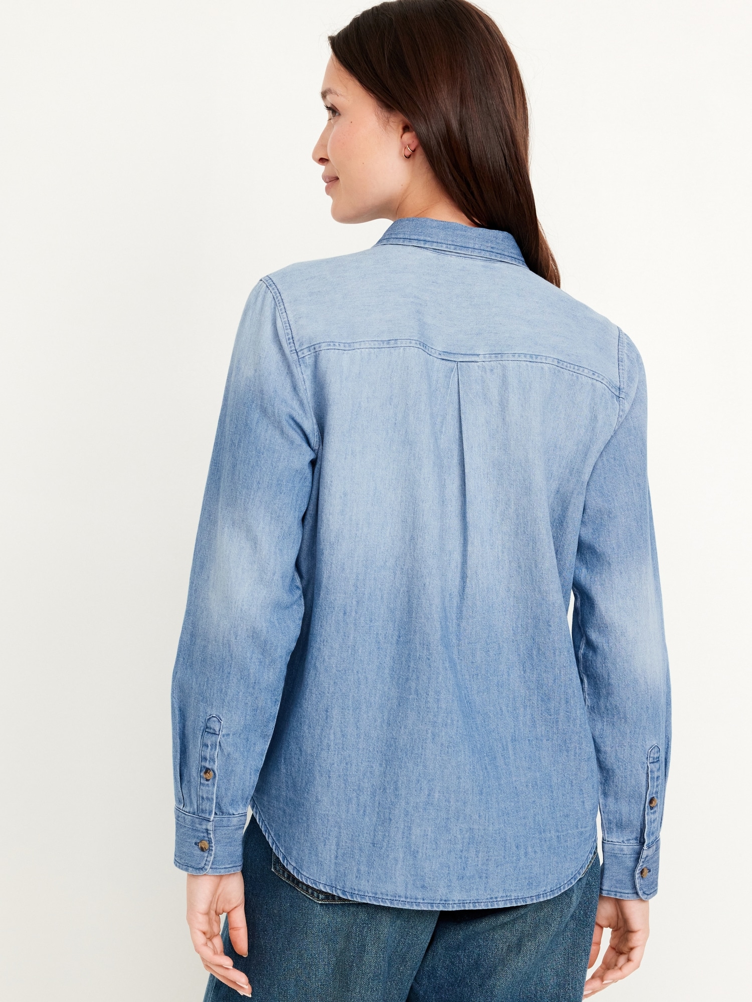 Classic Button-Down Jean Shirt: spread collar, long sleeves, buttoned cuffs, button front, patch chest pocket, curved hem, fading, #576683