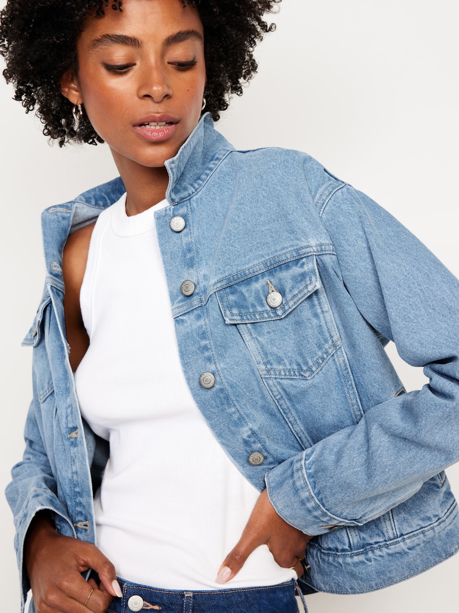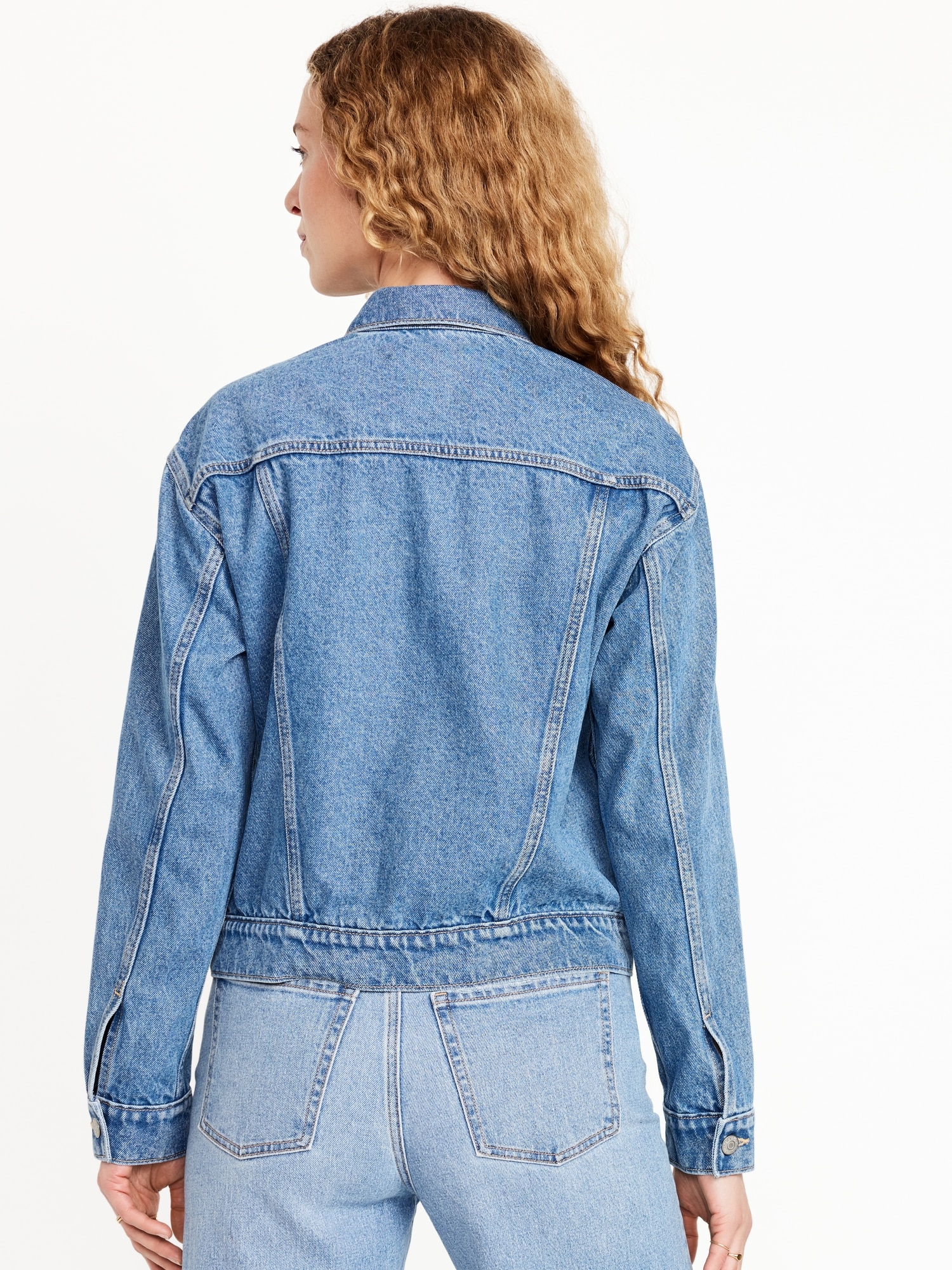 Classic Jean Jacket: spread collar, long sleeves, buttoned cuffs, button front, button-flap chest pockets, vertical welt pockets, adjustable button tabs at back waist, #465150