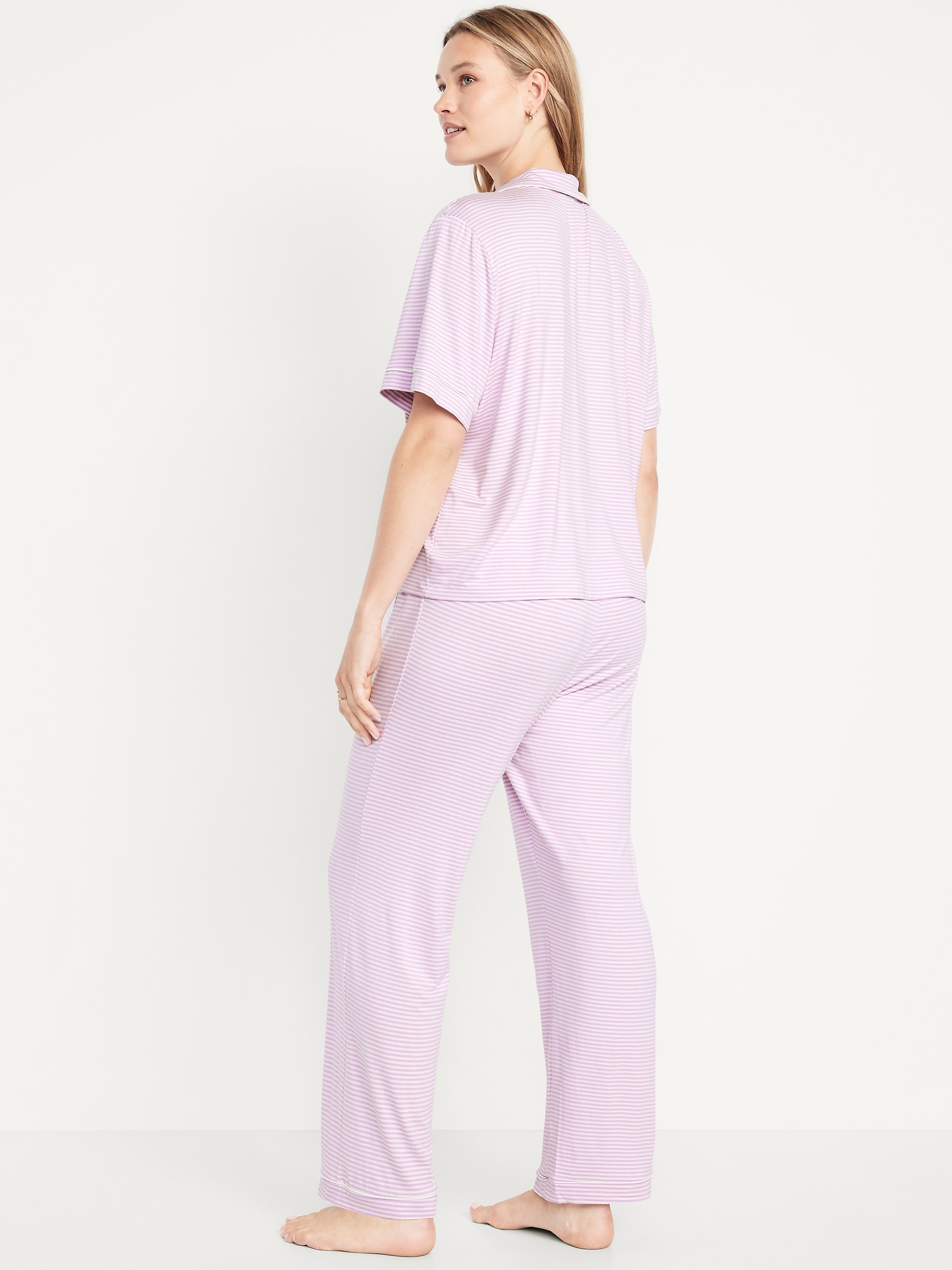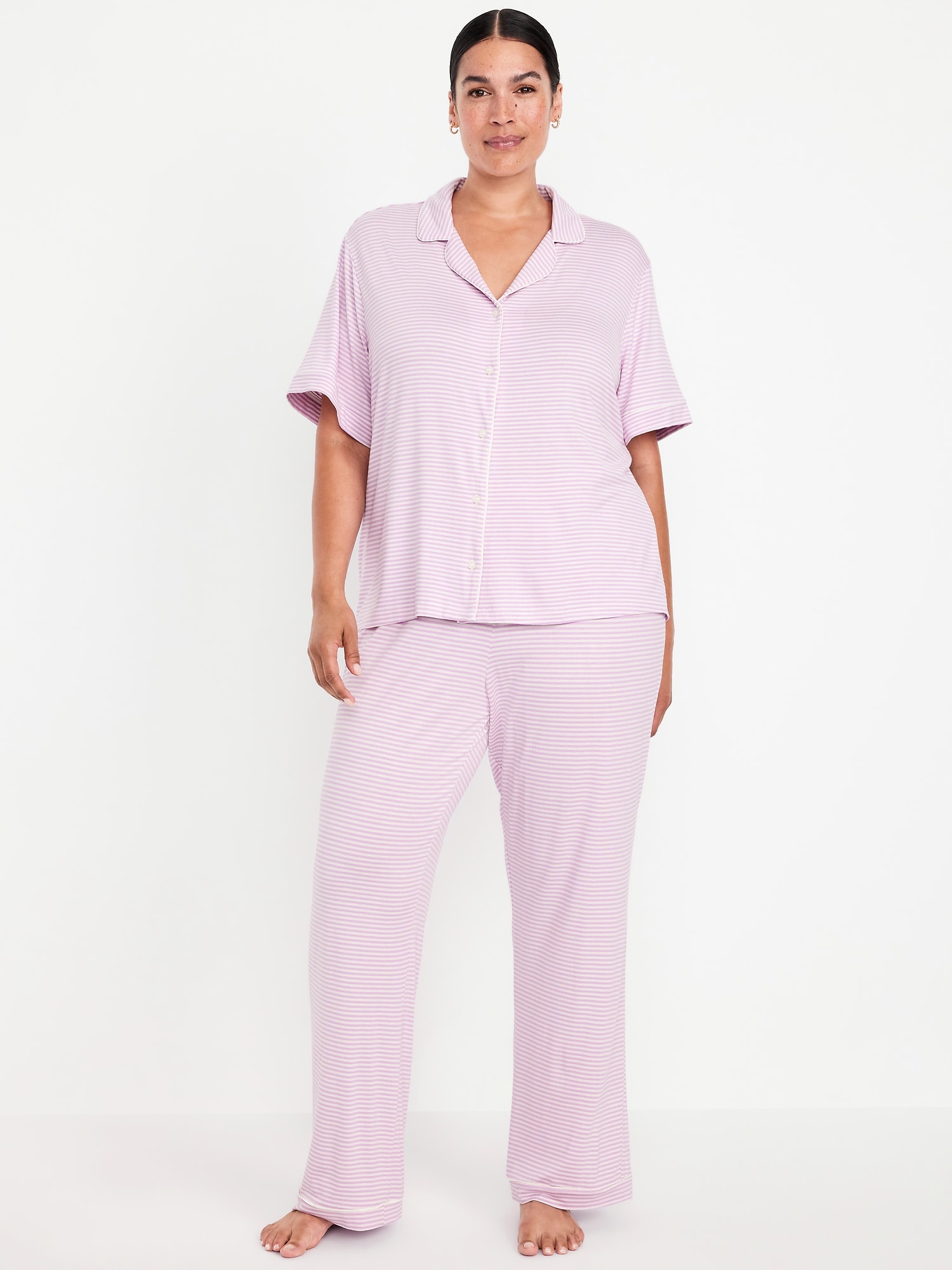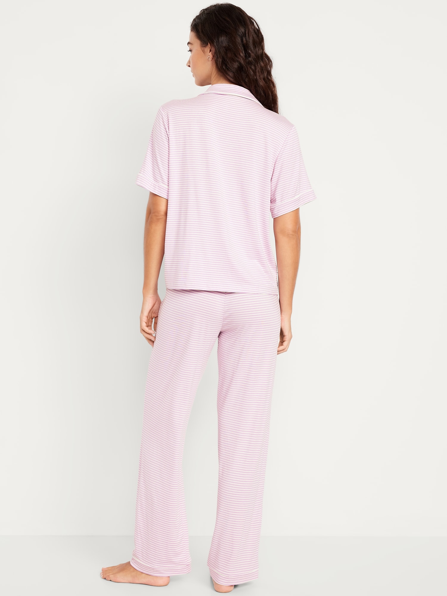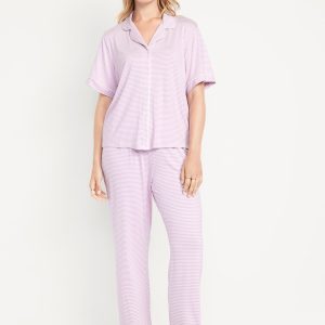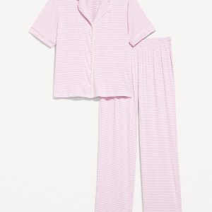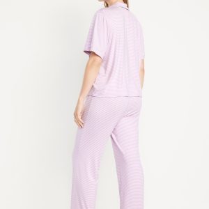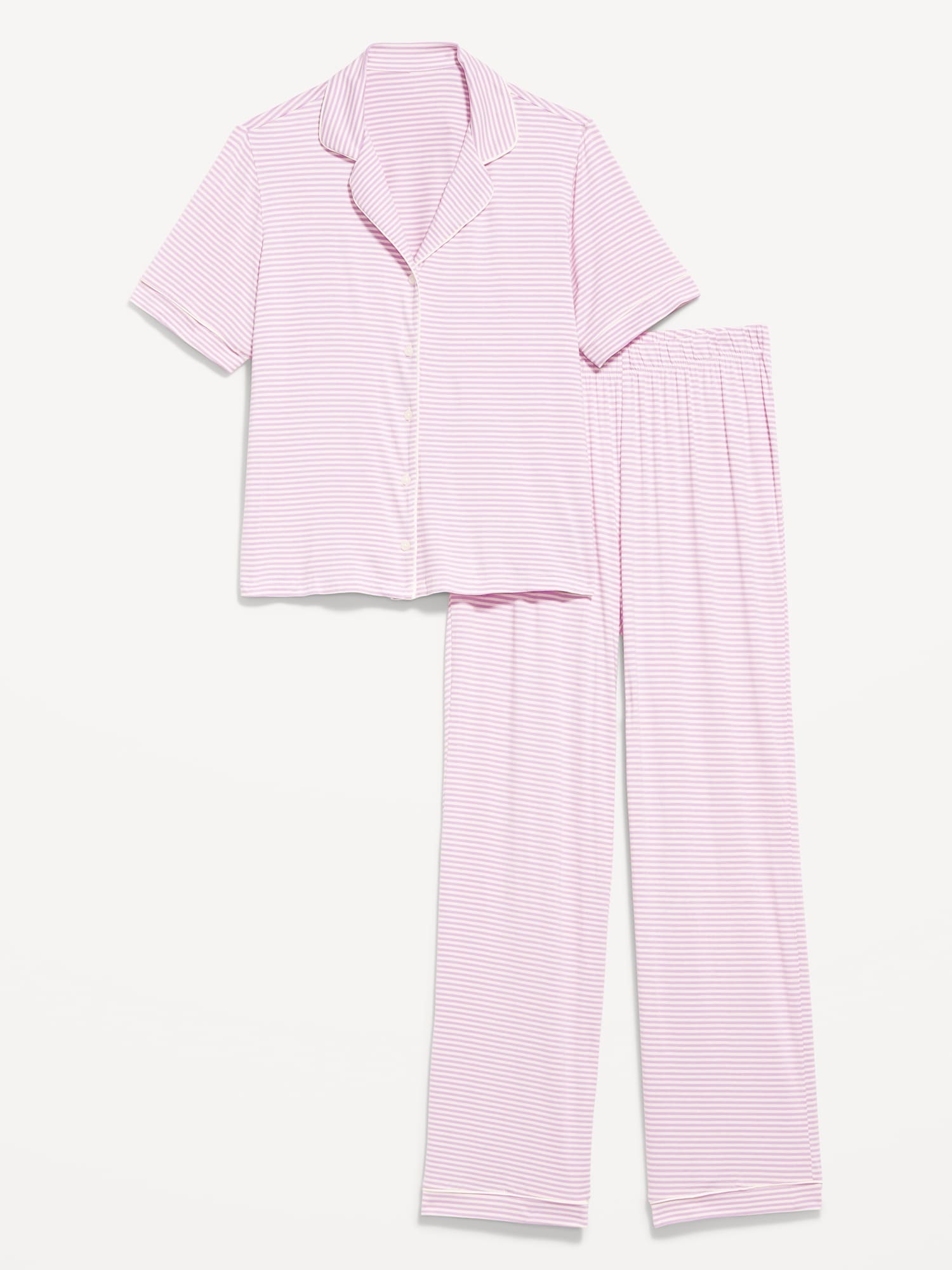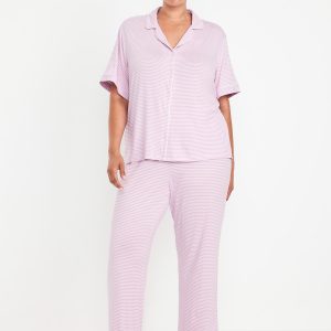 Classic Jersey Pajama Pant Set: set includes pajama shirt and matching bottoms, notched collar, short sleeves, button front, elastic-waist pajama pants with piping at hem, striped print, #808325