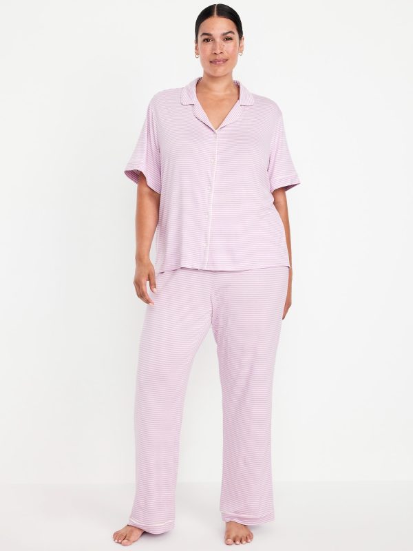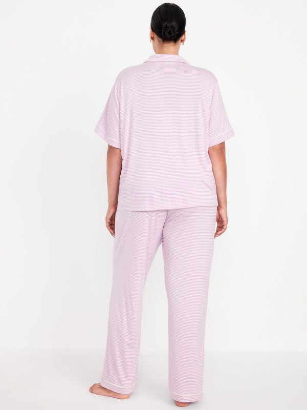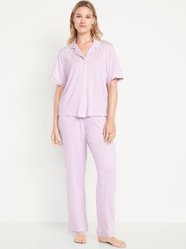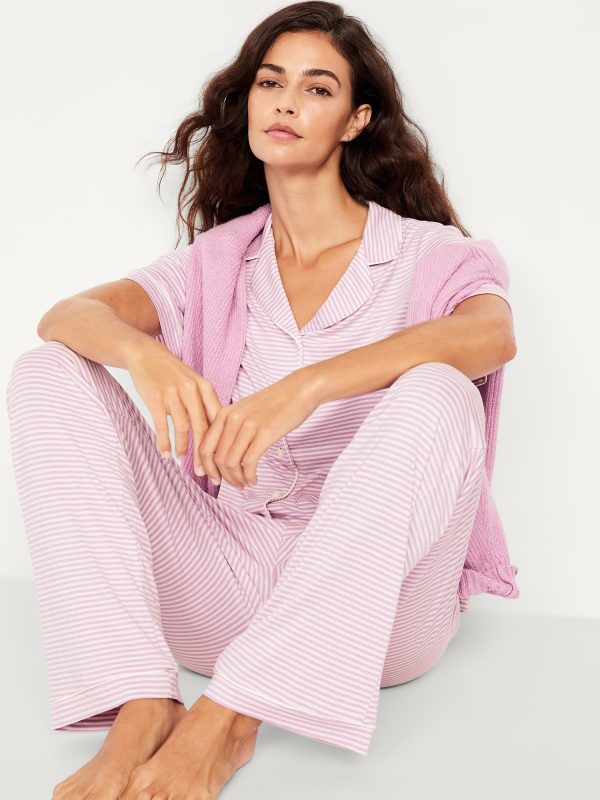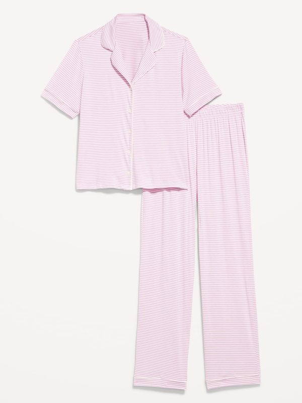 Classic Jersey Pajama Pant Set: set includes pajama shirt and matching bottoms, notched collar, short sleeves, button front, elastic-waist pajama pants with piping at hem, striped print, #808325