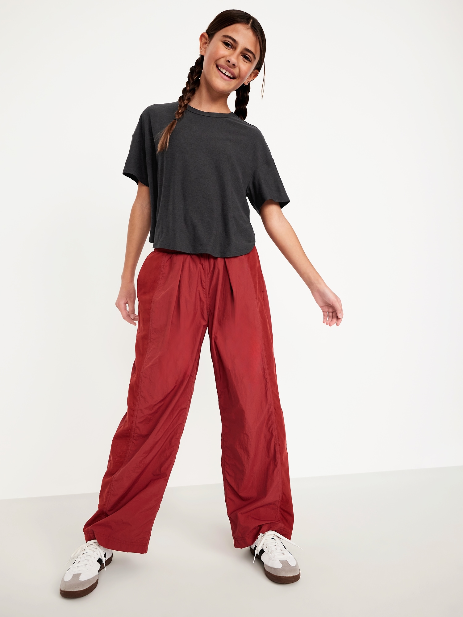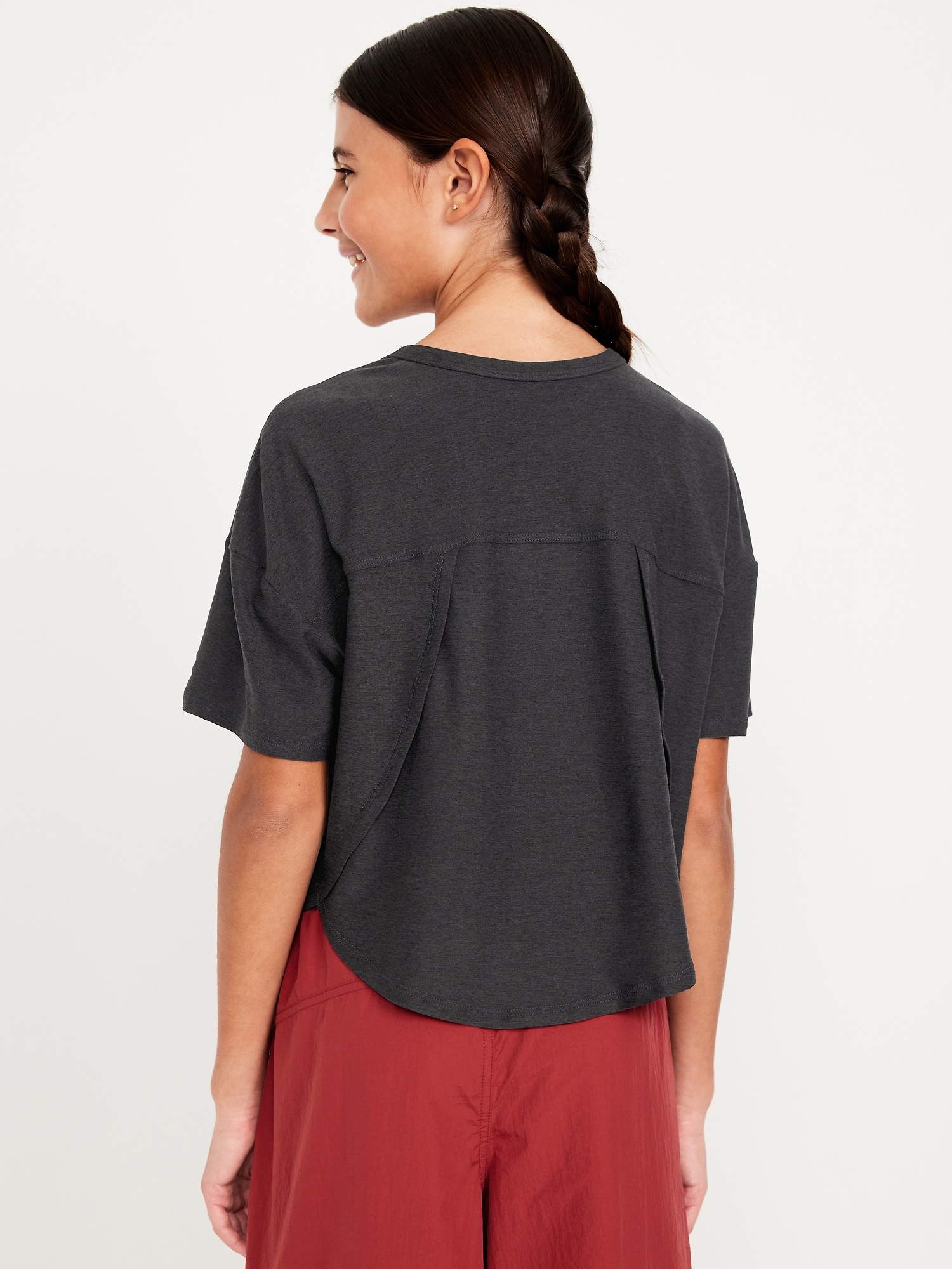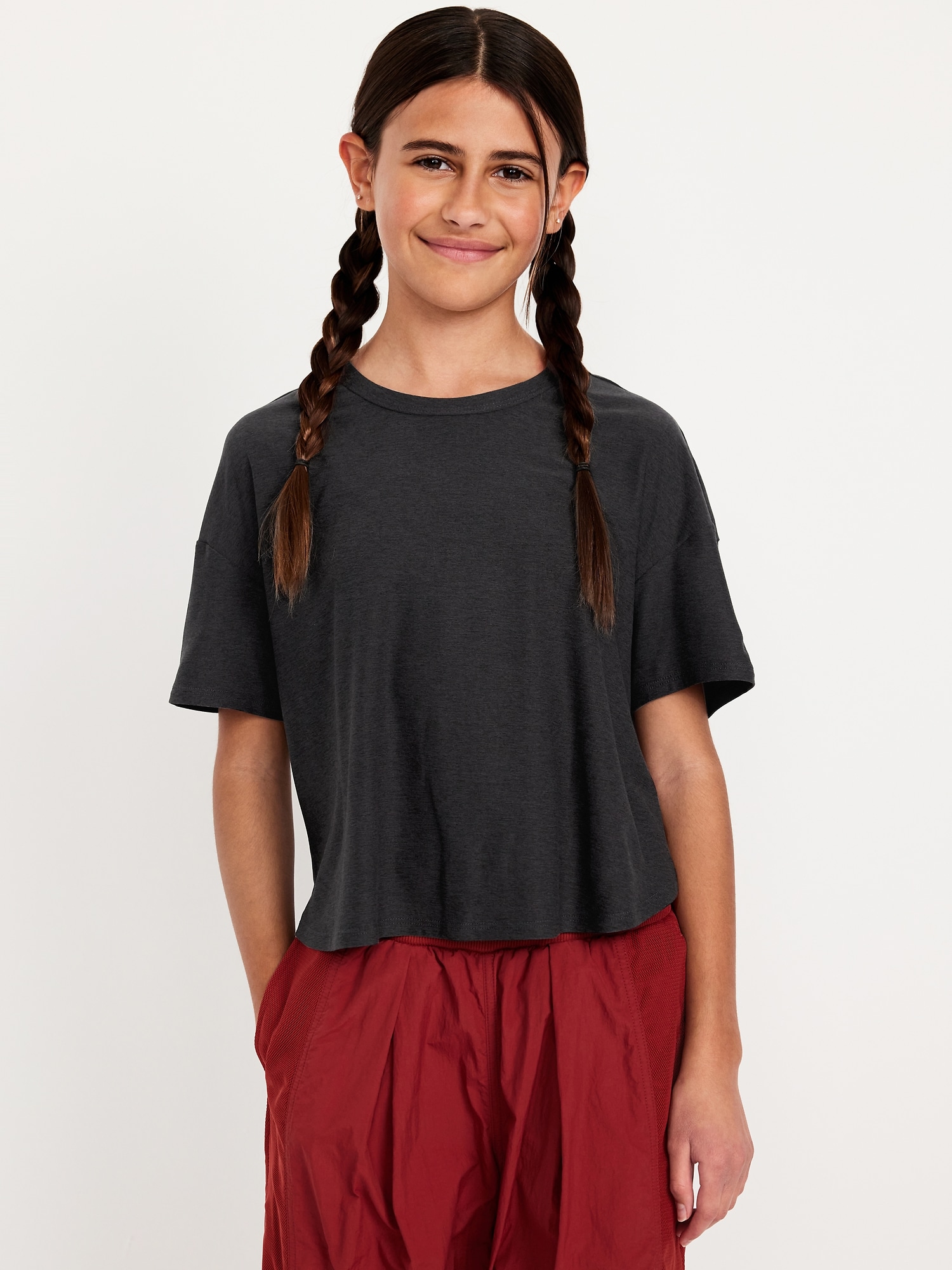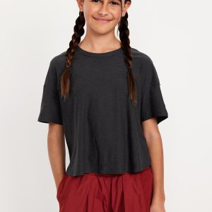 CloudMotion Cropped Performance T-Shirt for Girls: crew neck, short sleeves, drop shoulders, tulip hem, slightly cropped, #694626