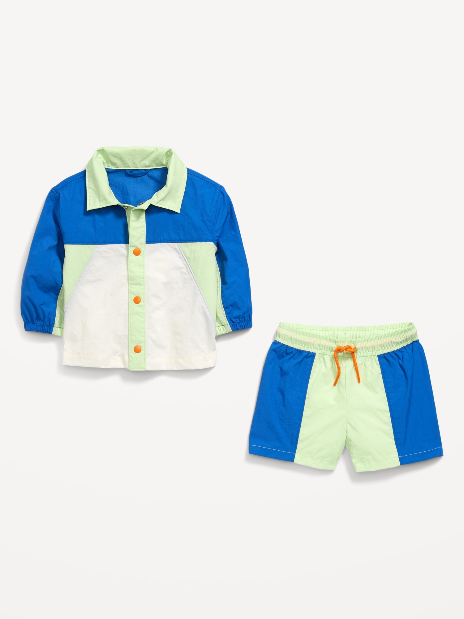 Color-Block Jacket and Shorts Set for Baby: spread collar, long sleeves, snap-button placket, matching shorts, elasticized waistband, functional drawstring, forward seams, color block, #761910