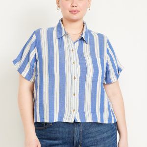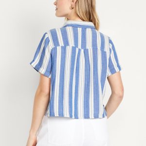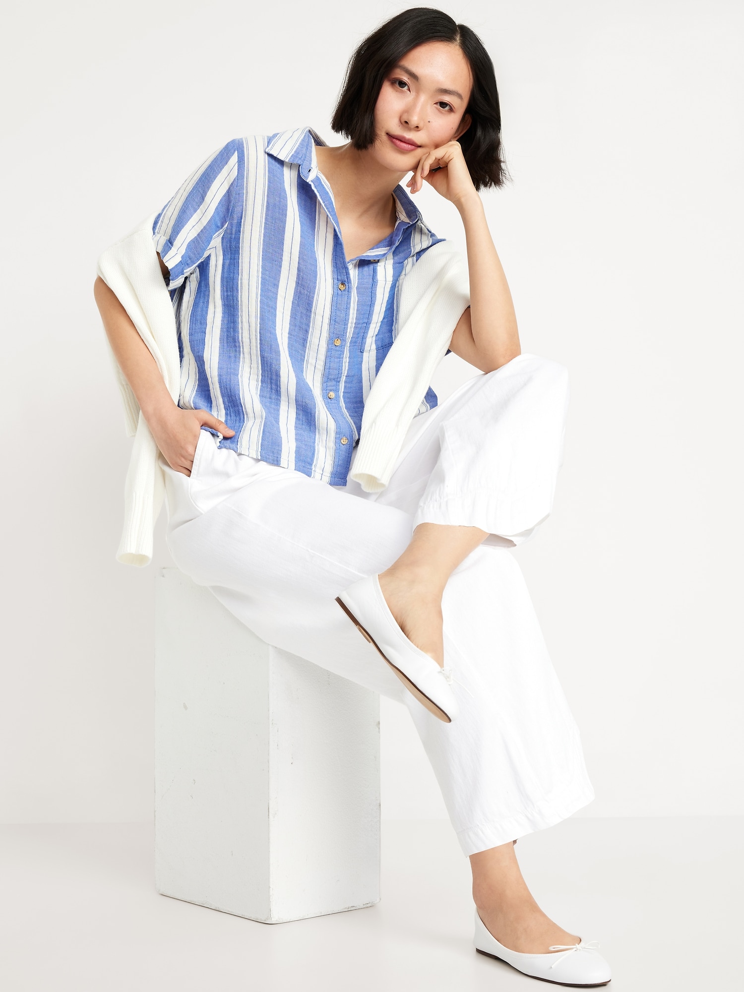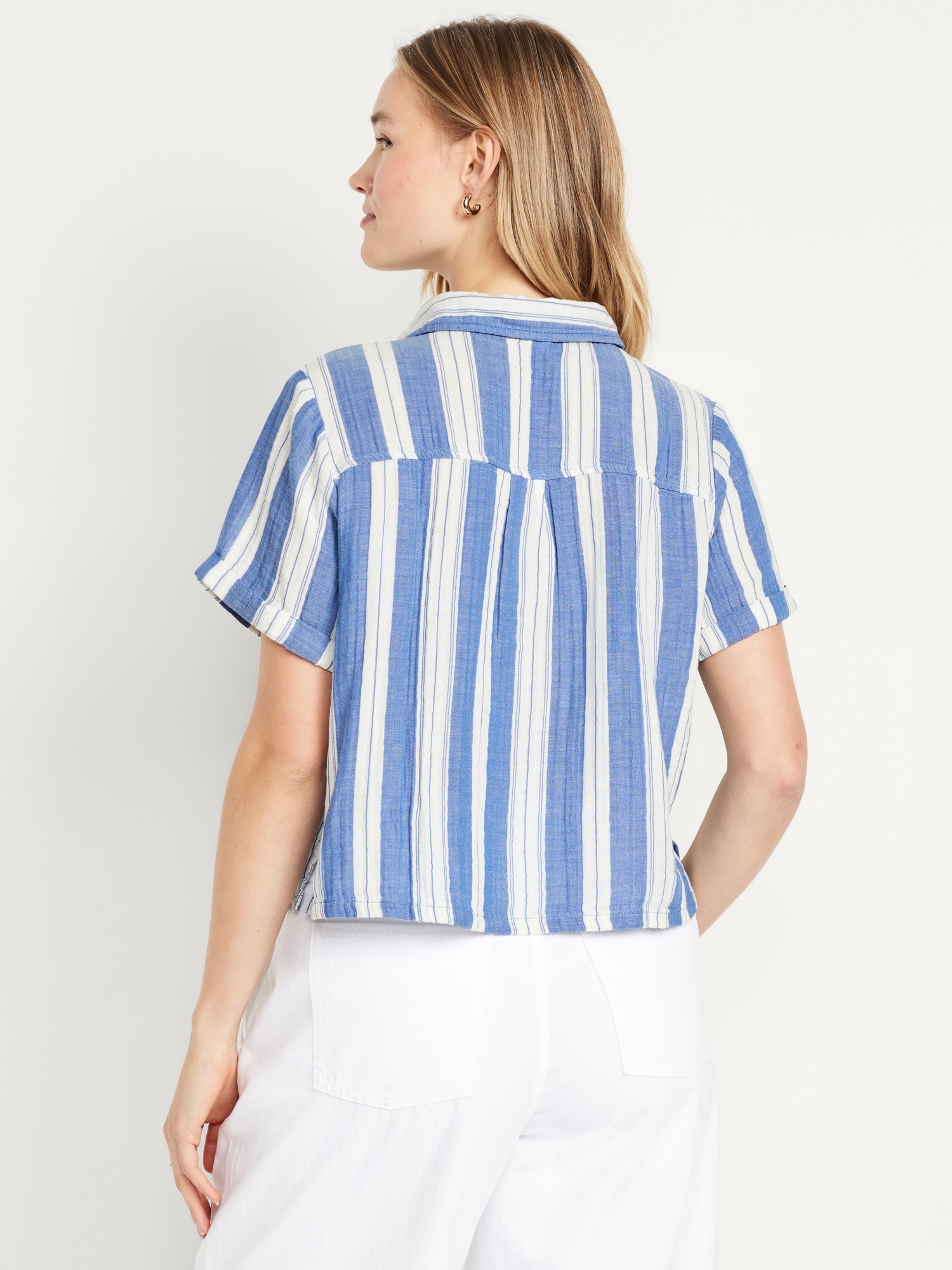 Crinkle Gauze Button-Down Striped Shirt: Drapey, laid-back and ready for the breeze.spread collar, short sleeves, full-button front, seamed back yoke, #704203
