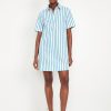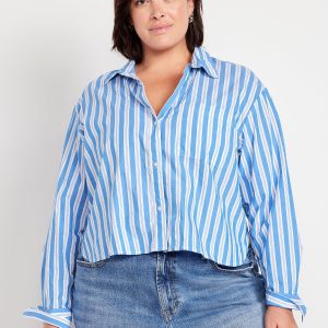 Cropped Button-Down Shirt: spread collar, long sleeves with buttoned cuffs, full-button front, patch chest pocket, vertical striped print, #825106