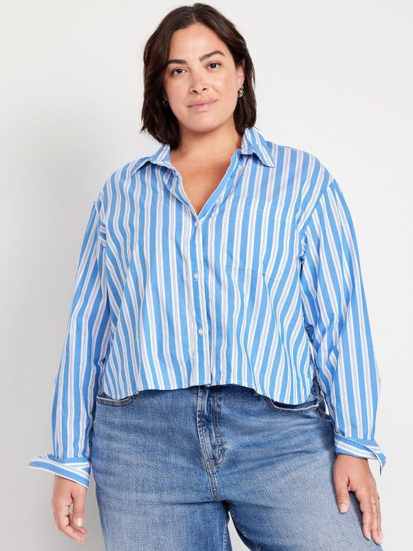 Cropped Button-Down Shirt: spread collar, long sleeves with buttoned cuffs, full-button front, patch chest pocket, vertical striped print, #825106