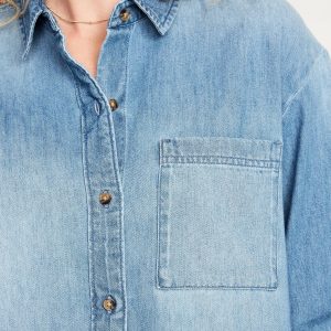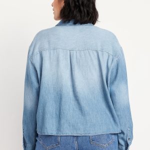 Cropped Jean Button-Down Shirt: spread collar, long sleeves with buttoned cuffs, full-button front, patch chest pocket, vertical striped print, #825106