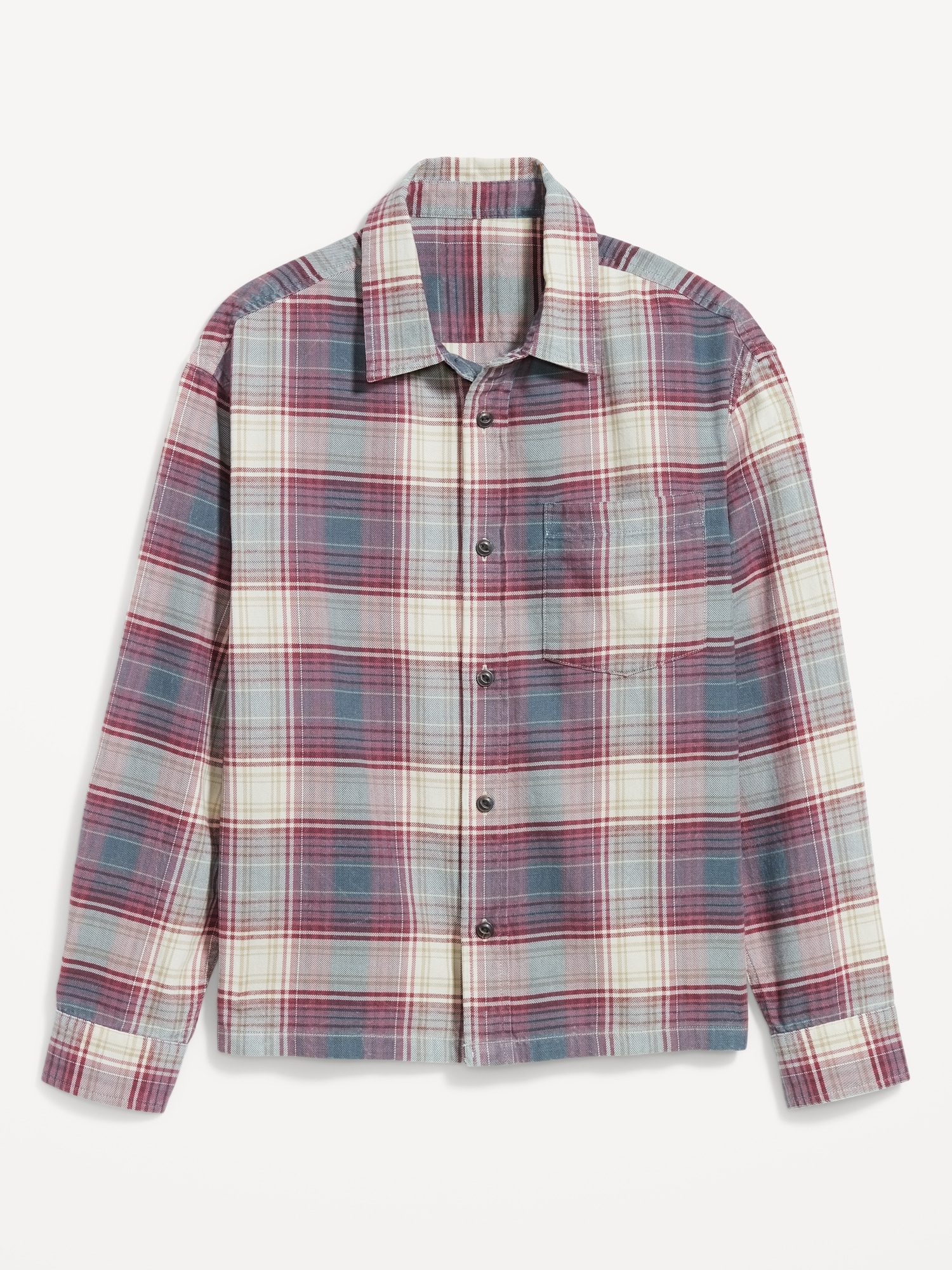 Cropped Plaid Flannel Shirt: spread collar, long sleeves with buttoned cuffs, full-button front, patch chest pocket, plaid print, #805557