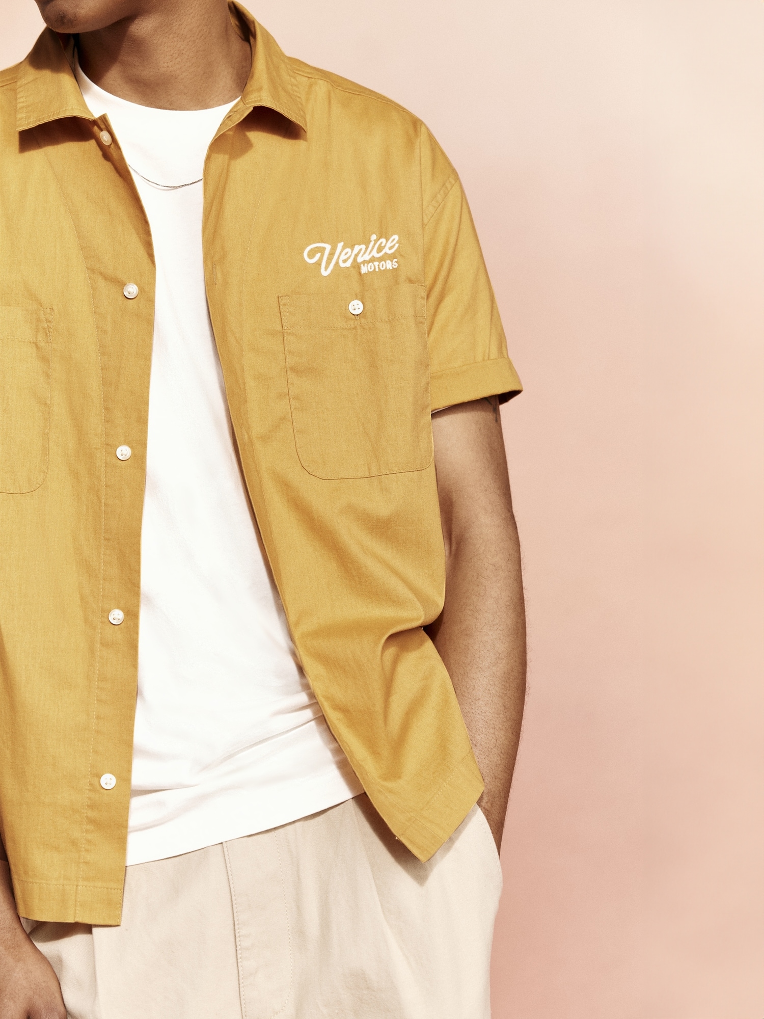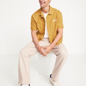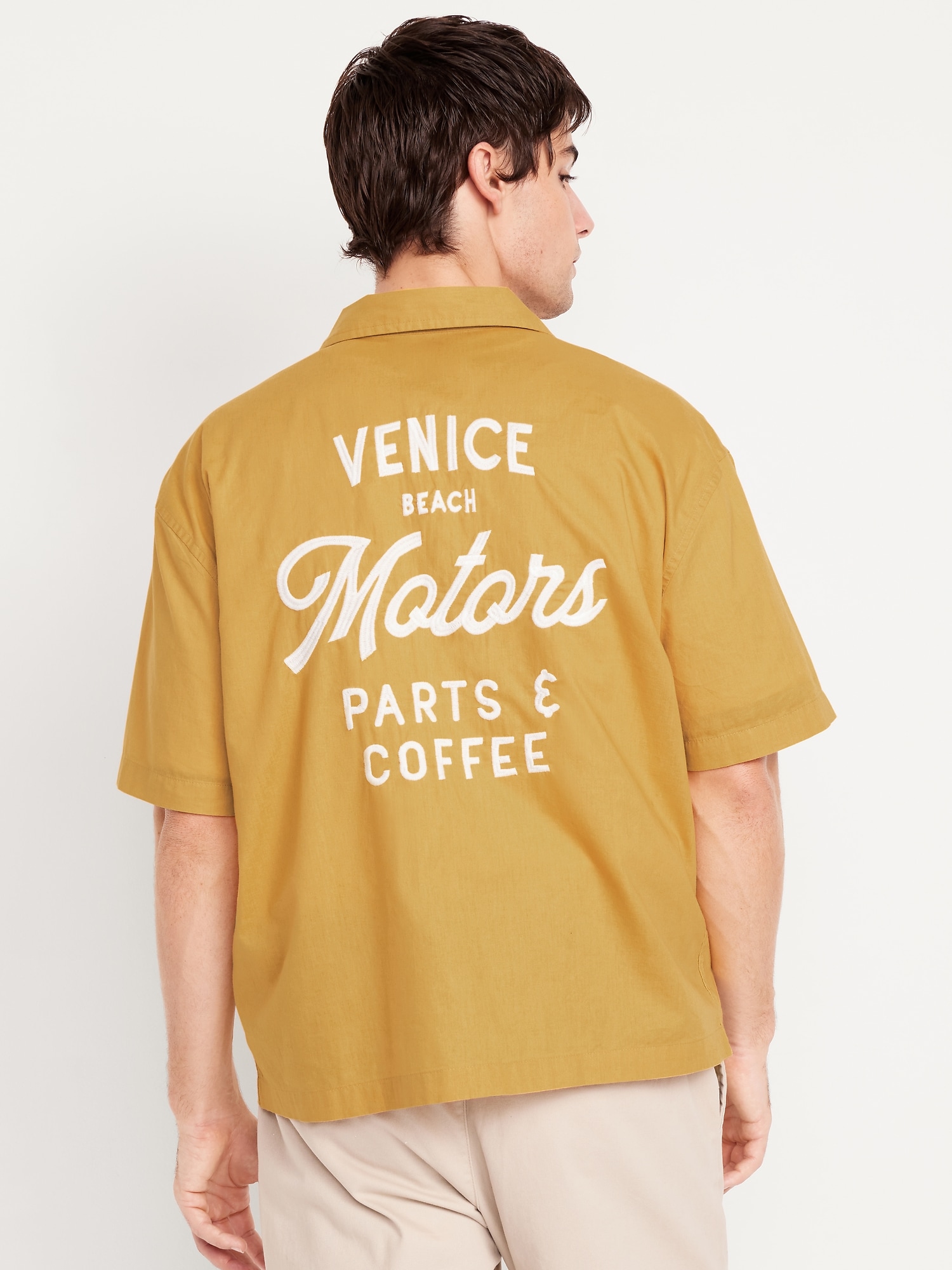 Cropped Utility Dobby Shirt: notched collar, short sleeves, embroidered chest graphic varies, button-patch chest pockets, full-button front, #762369