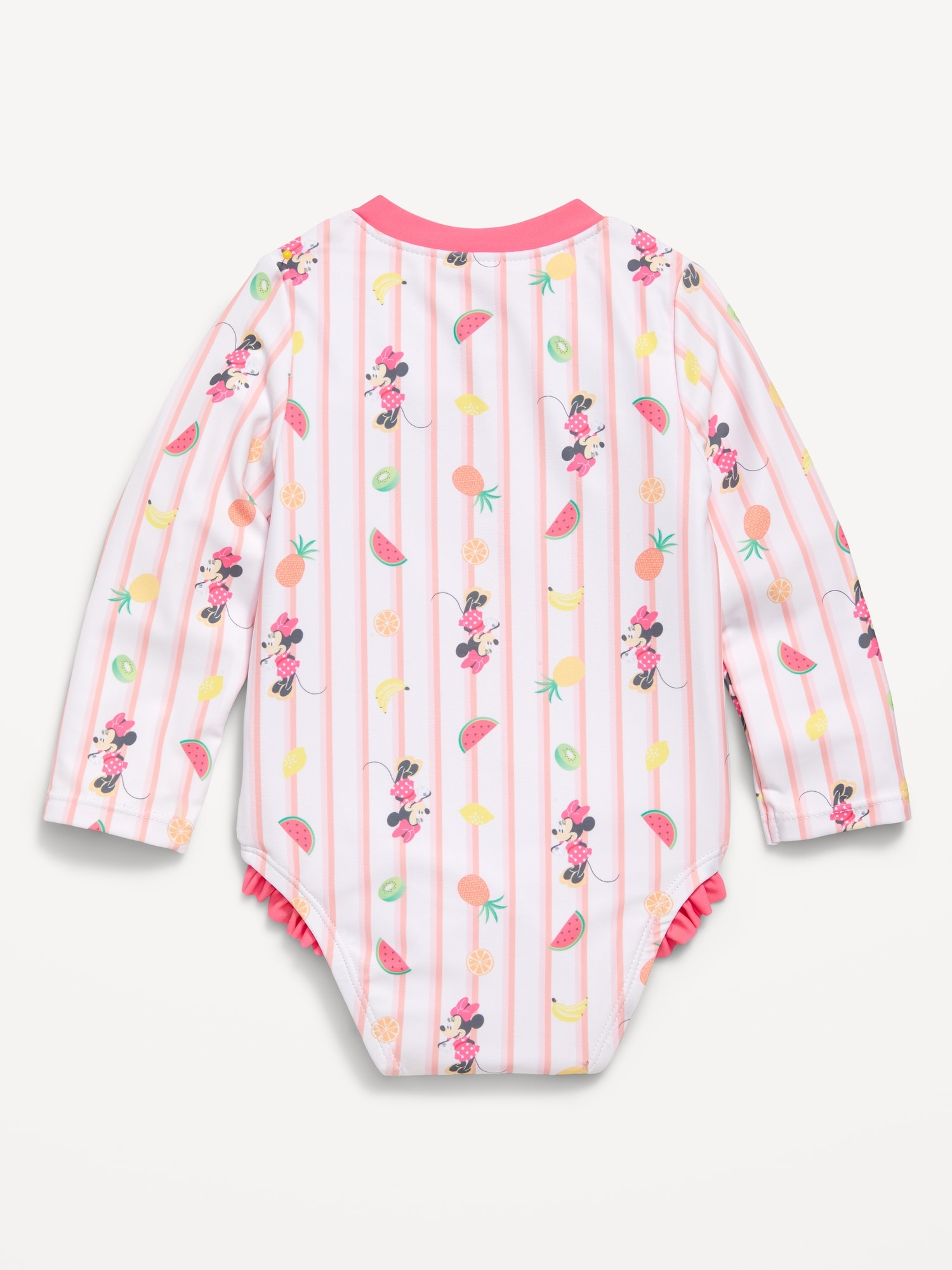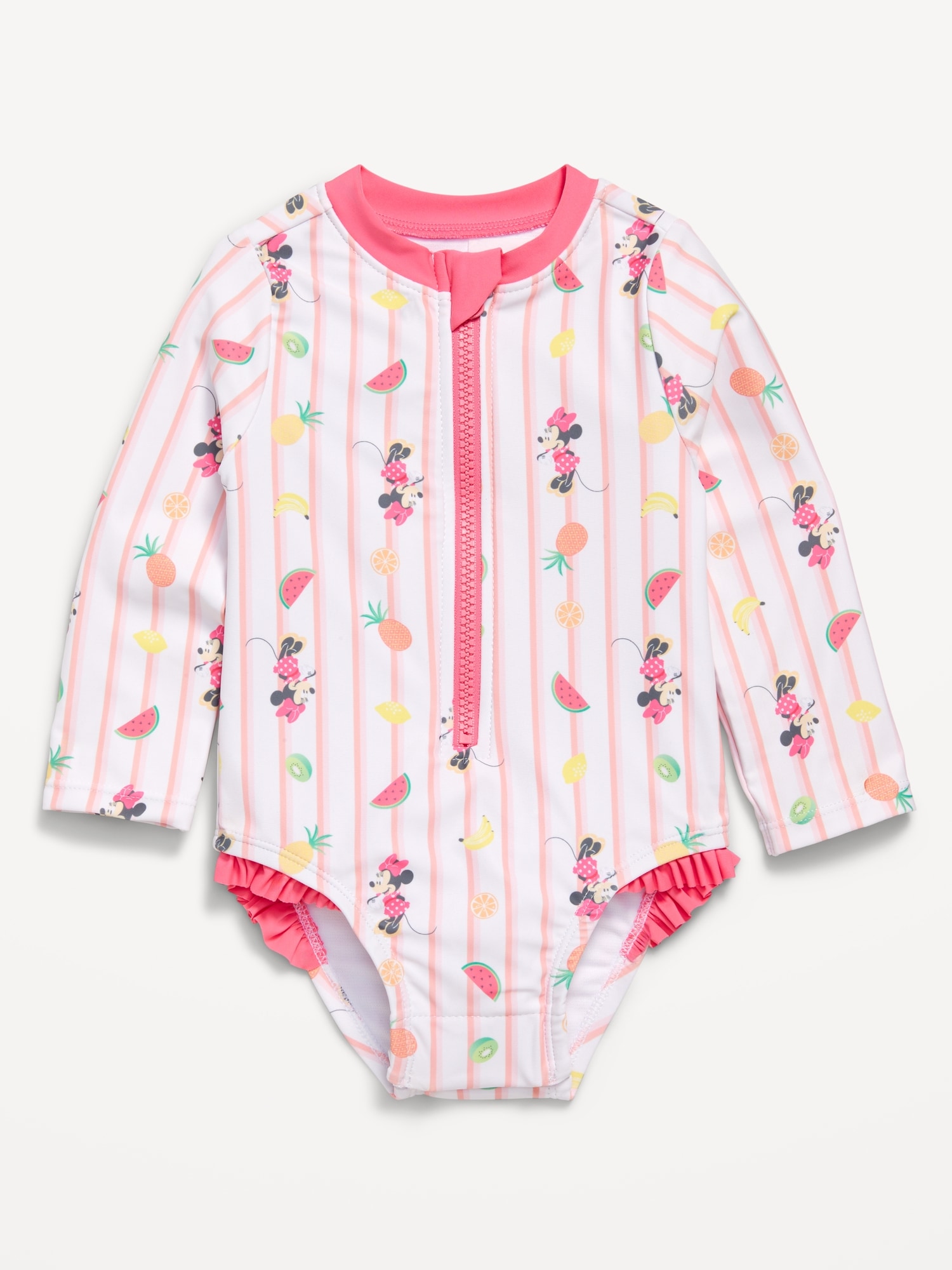 Disney© Minnie Mouse Zip-Front Rashguard One-Piece Swimsuit for Baby: crew neck, long sleeves, center zipper, elasticized leg openings, ruffled trim along leg openings, licensed graphic, © Disney., #694161