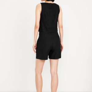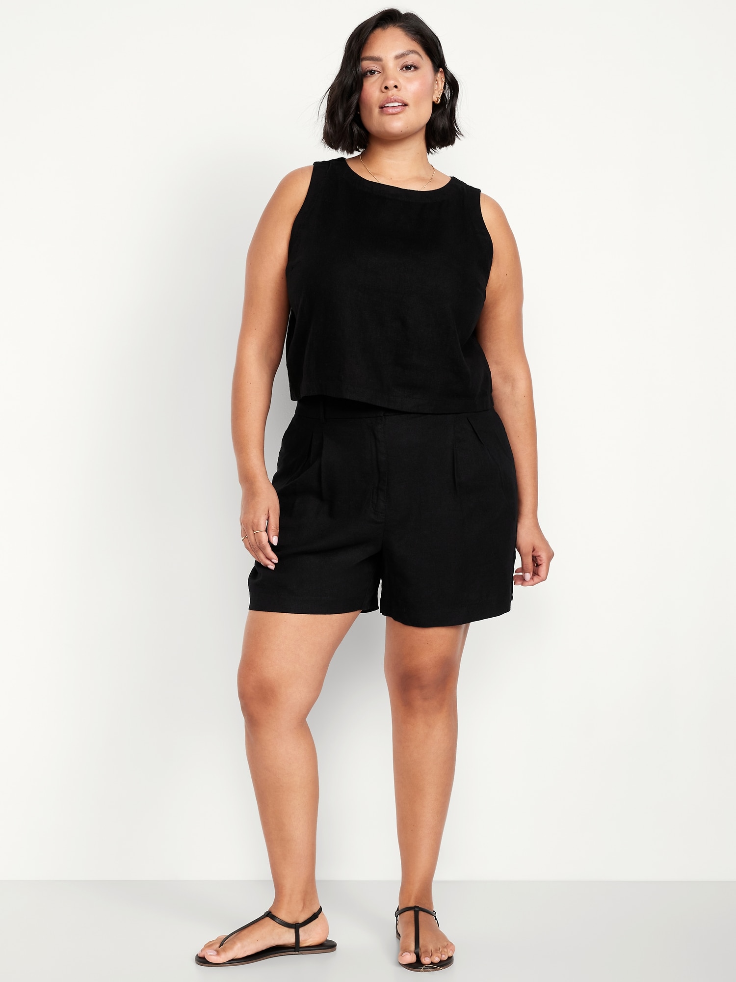 Extra High-Waisted Linen-Blend Taylor Trouser Shorts — 5-inch inseam: extra high adjustable waist, hook-and-bar closure, belt loops, hip pockets, functional back welt pocket, pleated front, #748111