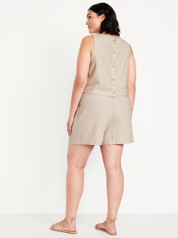 Extra High-Waisted Linen-Blend Taylor Trouser Shorts — 5-inch inseam: extra high adjustable waist, hook-and-bar closure, belt loops, hip pockets, functional back welt pocket, pleated front, #748111