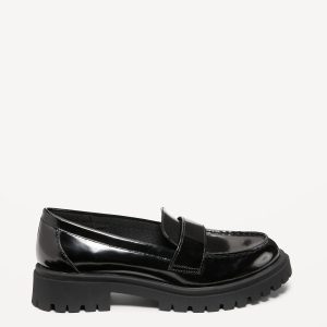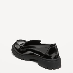 Faux-Leather Chunky Heel Loafers: textured faux-leather upper, loafer strap at vamp, cushioned foot bed, rugged lug sole, chunky heel, #544280