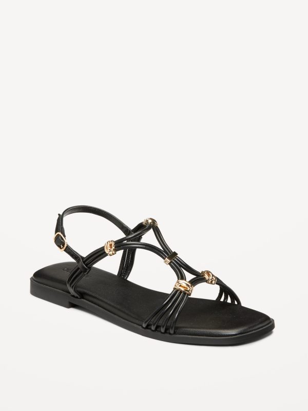 Faux-Leather Strappy Hardware Sandals: faux-leather upper, black: knotted gold-tone detail, bone: knotted silver-tone detail, buckle fastening at ankle, cushioned foot bed, #751054