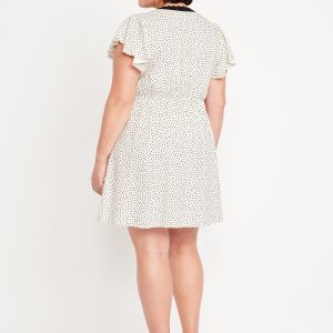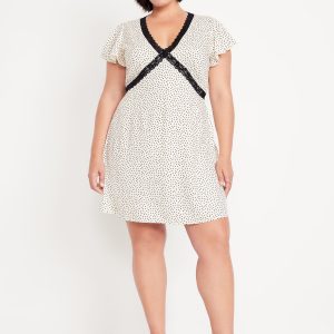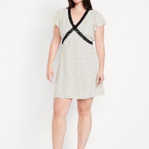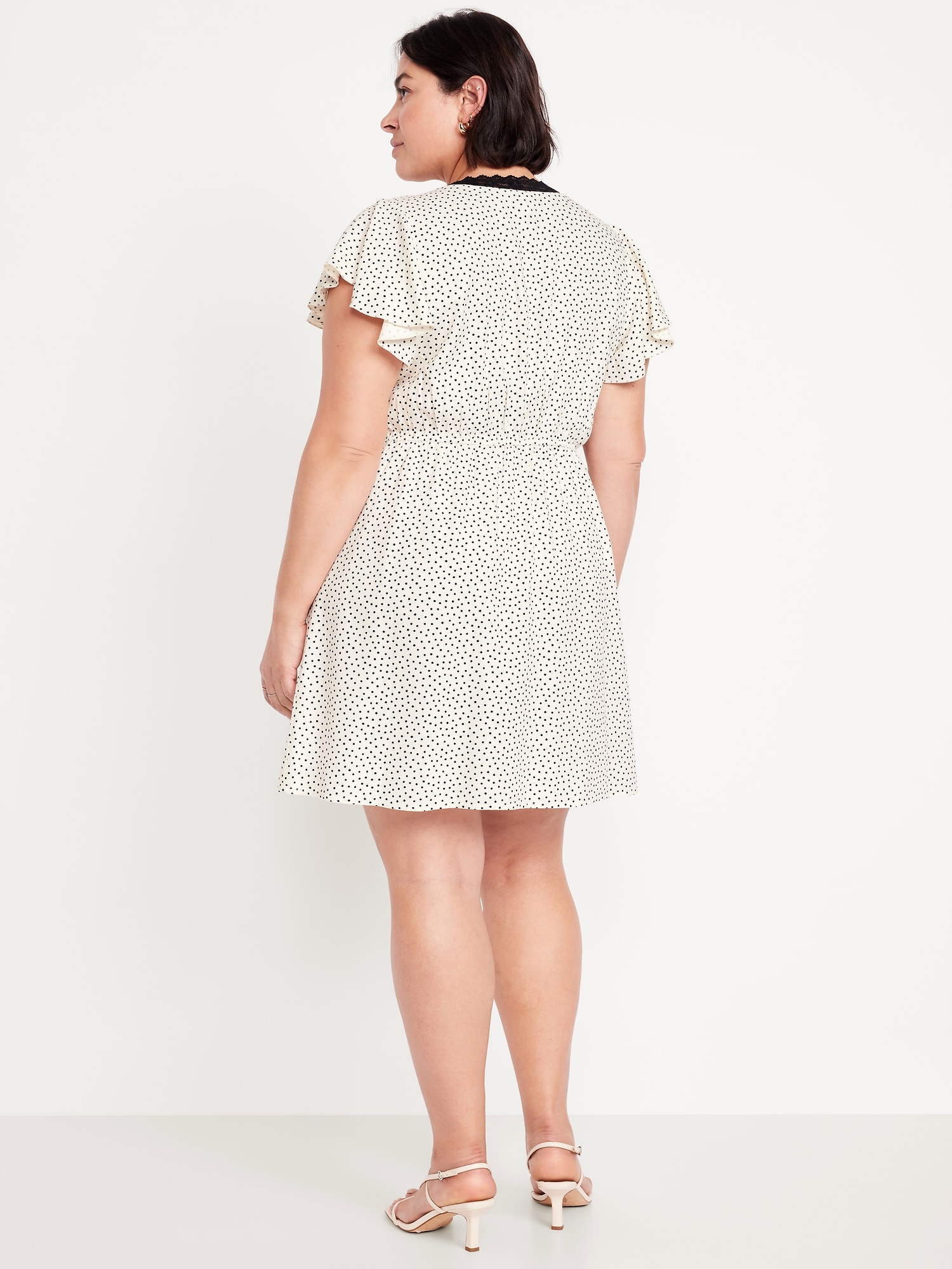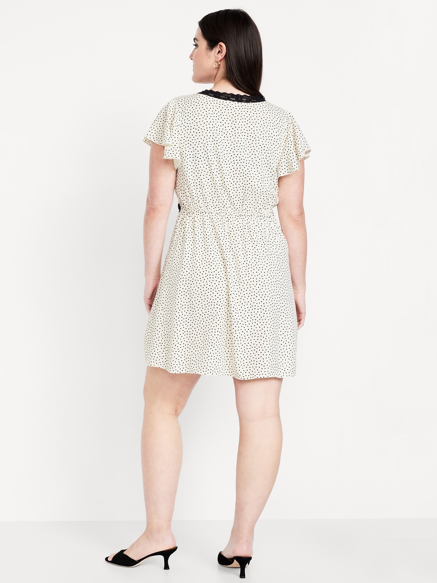 Fit & Flare Crepe Lace-Trim Mini Dress: lace-trim v-neck and bodice, short flutter sleeves, elasticized back waist, prints vary by color, #798245