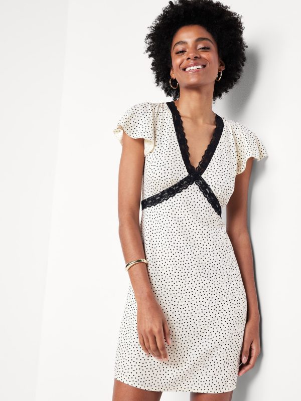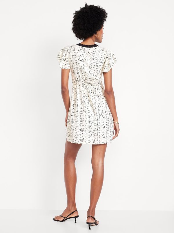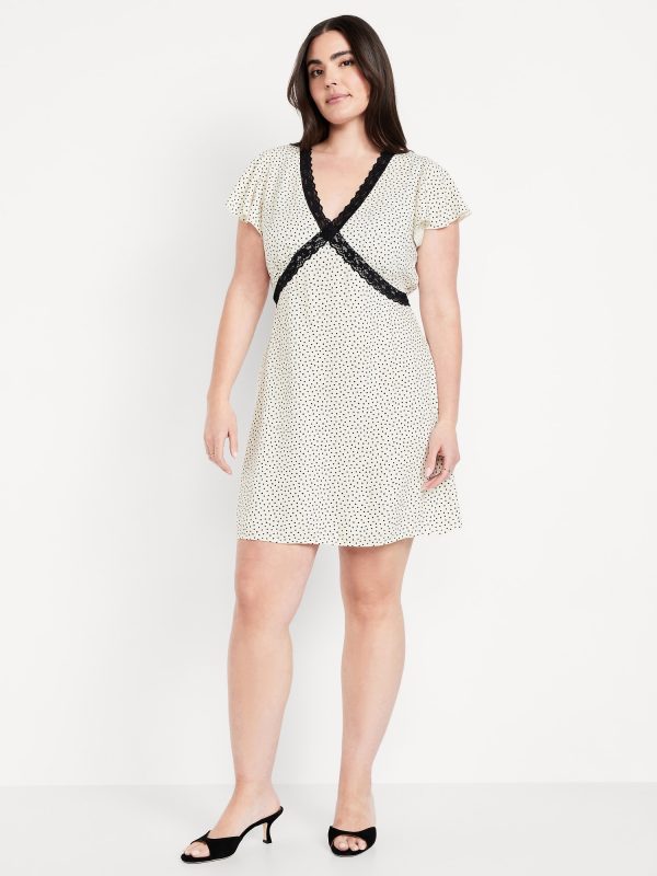 Fit & Flare Crepe Lace-Trim Mini Dress: lace-trim v-neck and bodice, short flutter sleeves, elasticized back waist, prints vary by color, #798245