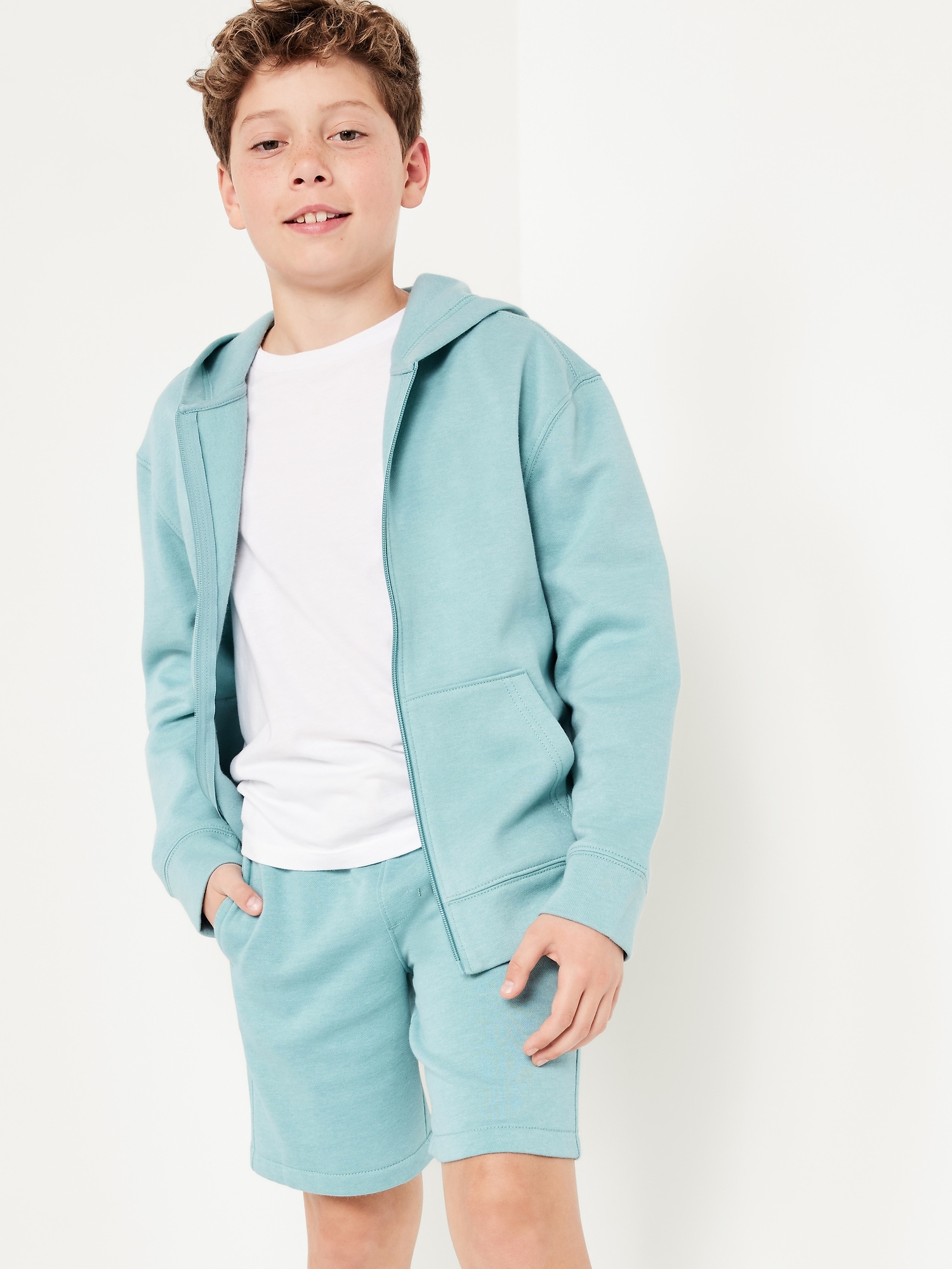 Fleece Jogger Shorts for Boys (At Knee): elasticized waistband, interior drawstring, on-seam welt pockets, #685948