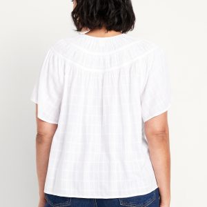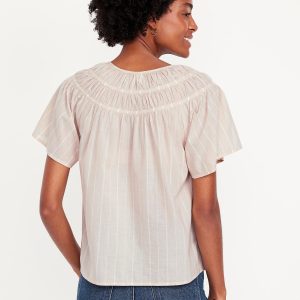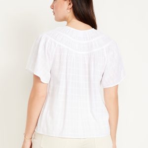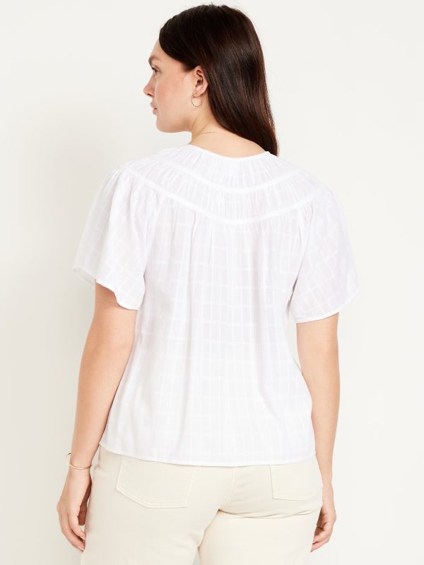 Flutter-Sleeve Dobby Top: shirred neckline, front button-loop keyhole closure, short flutter sleeves, floral print, #704186