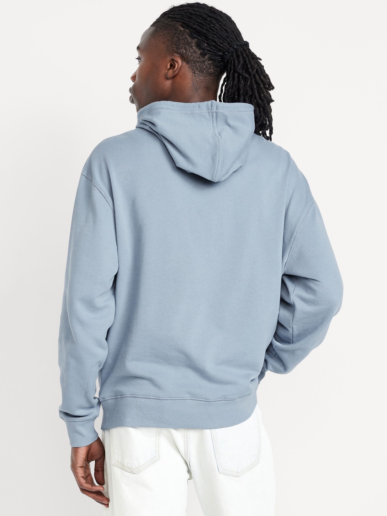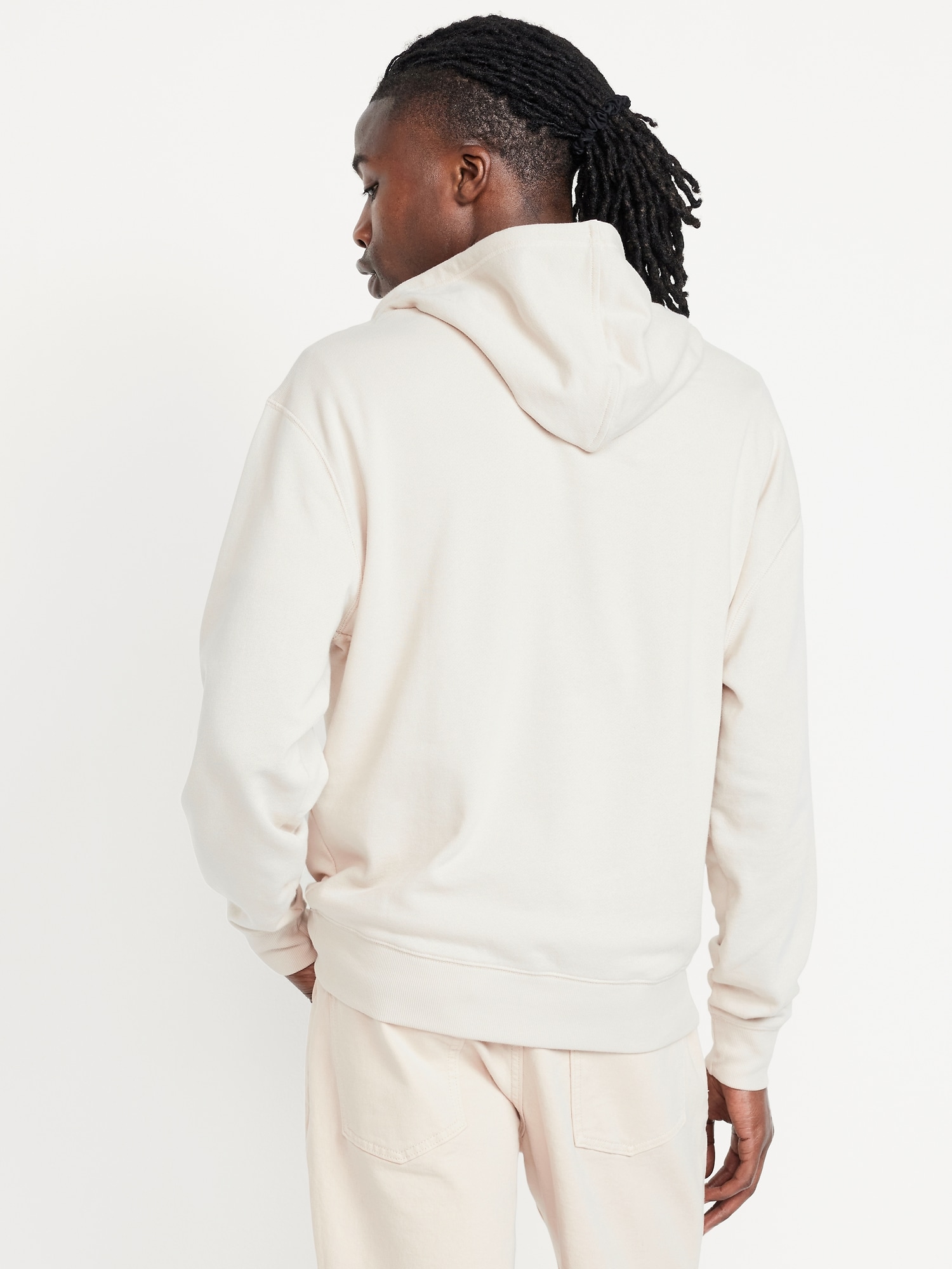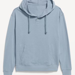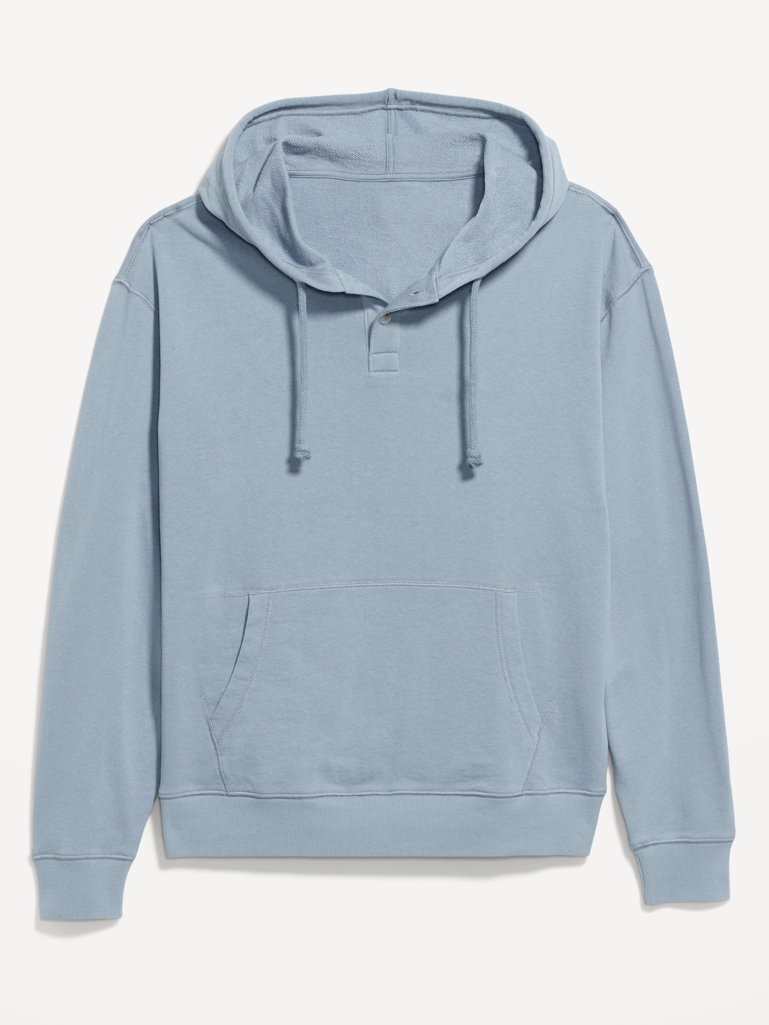 French Terry Pullover Hoodie: drawstring hood, long sleeves, henley-button placket, kangaroo pocket, rib-knit cuffs and hem, pullover style, #717405