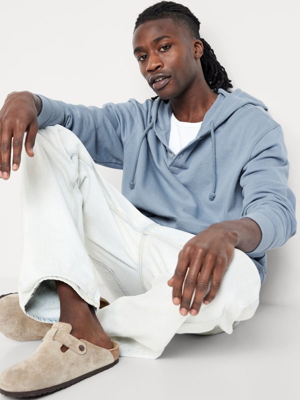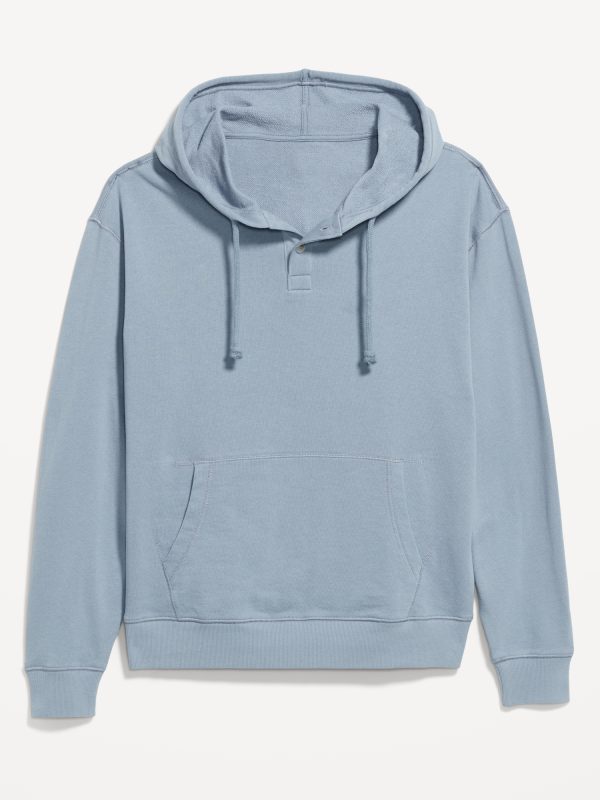 French Terry Pullover Hoodie: drawstring hood, long sleeves, henley-button placket, kangaroo pocket, rib-knit cuffs and hem, pullover style, #717405