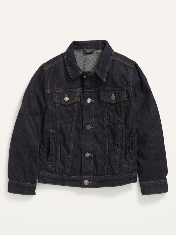 Gender-Neutral Cotton Non-Stretch Jean Jacket for Kids: This jean jacket is totally classic & gender neutral, too. Wearable & shareable for you, for him, for her, for them!, Spread collar., Seamed yoke at front and back., Long sleeves, with buttoned cuffs., Five button front., Button-flap chest pockets., Vertical welt pockets at front., Banded hem, with adjustable button tabs at back waist., Soft, durable 100% cotton non-stretch denim., #820928