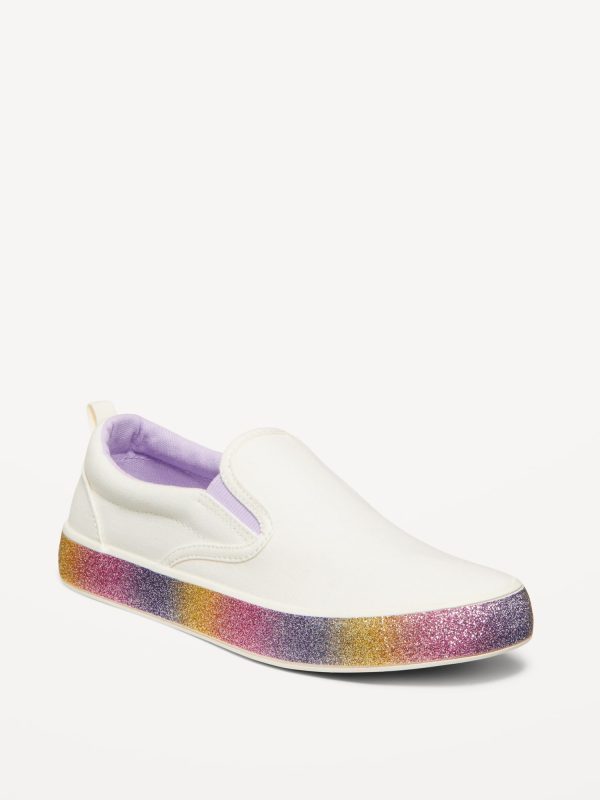 Glitter Canvas Slip-On Sneakers for Girls: webbed goring at sides, round toe, cushioned foot bed, thermoplastic rubber midsole, textured outsole, pull tab at heel, #508960