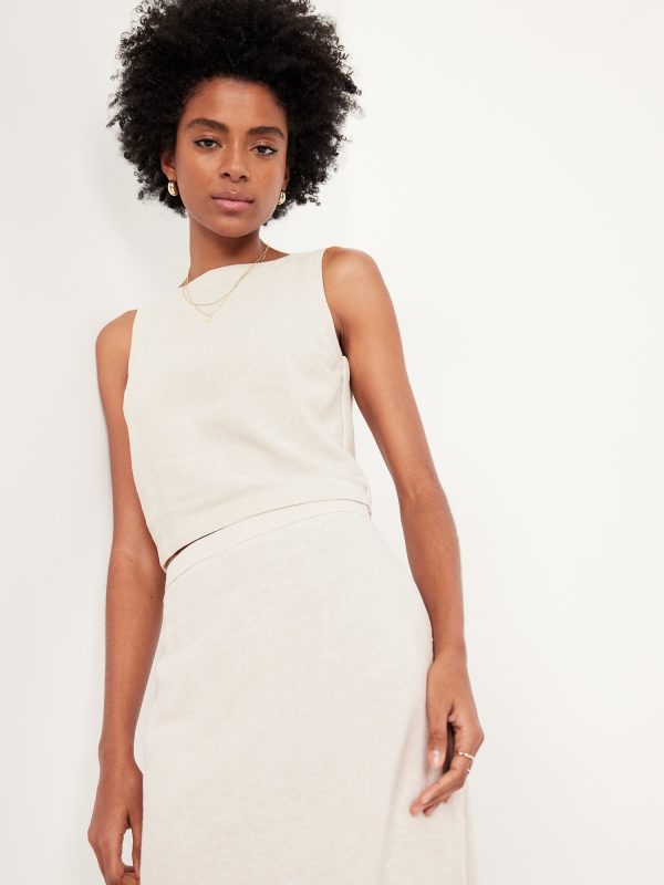 Hi-Neck Button-Back Linen-Blend Top: high neck, sleeveless, button back, #756729