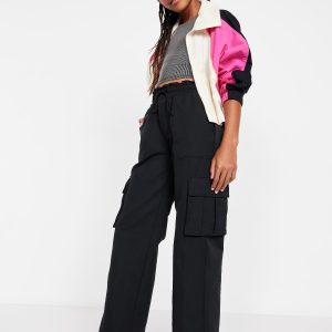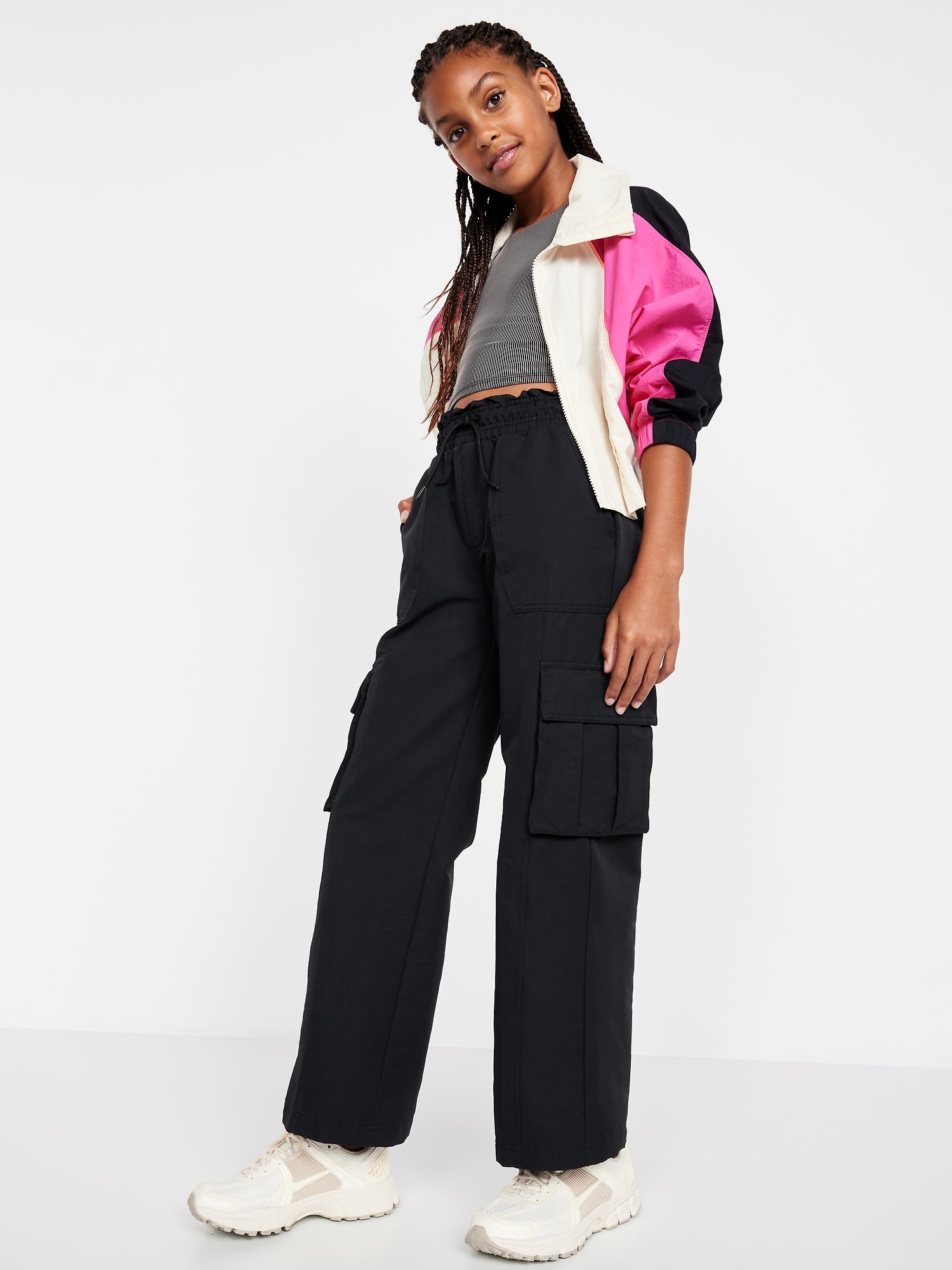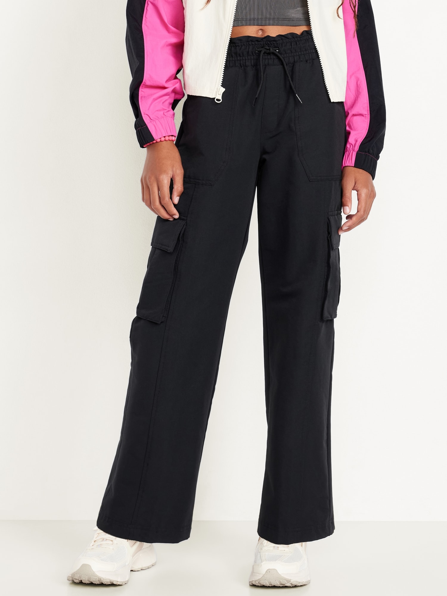 High-Waisted Cargo Wide-Leg Performance Pants for Girls: high rise, elasticized ruffled waistband, functional drawstring, diagonal on-seam pocket, flap cargo pockets, wide leg, #802737